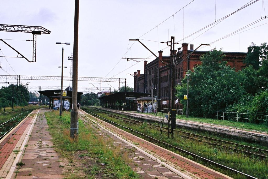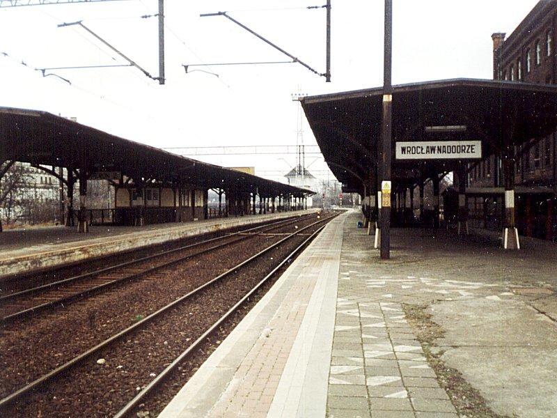 Wschodnia głowica rozjazdowa stacji, w tle stoi nastawnia wykonawcza WN1. Na pierwszym planie tor, który prowadzi na górkę rozrządową, stojącą po prawej stronie nastawni wraz z tarczą rozrządową. Jeszcze na początku lat 90. pamiętam jak SM42 pchała tu sznur kilkudziesięciu wagonów towarowych, które były później kierowane na odpowiednie tory kierunkowe przez manewrowych/ustawiaczy. Po jego lewej stronie jest tor komunikacyjny w kierunku placów ładunkowych i bocznic do zakładów położonych w północno-wschodniej części Nadodrza. Z prawej strony jupiter, który oświetlał tą część stacji. Za nim zaś jest niewidoczny wiadukt nad ul. Rychtalską. Widok w kierunku zachodnim - perony.