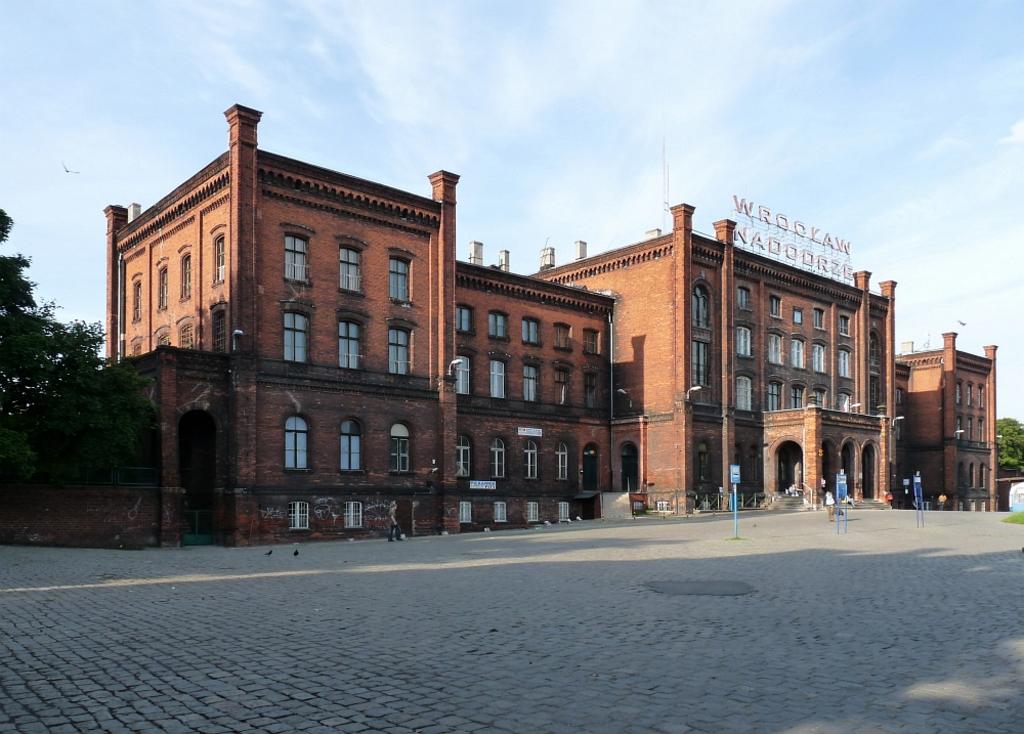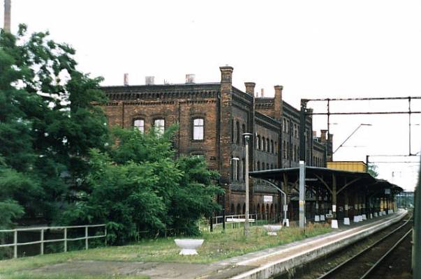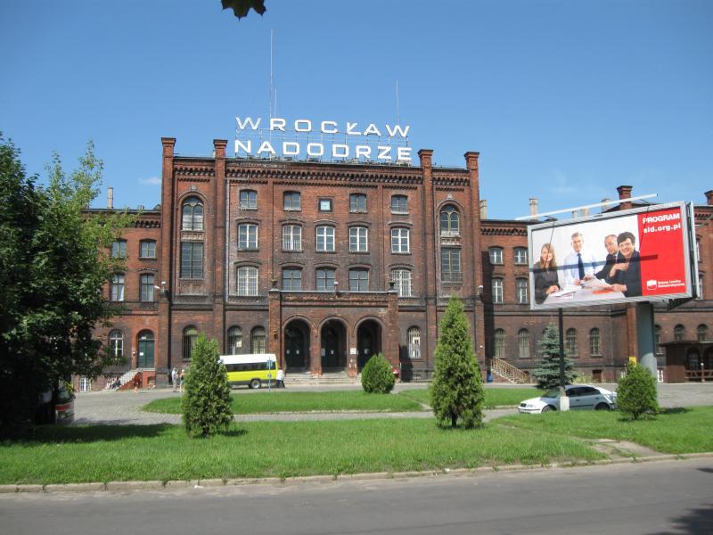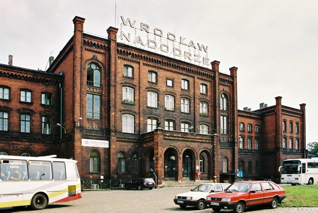 Wrocław Nadodrze budynek stacyjny, widok od strony placu manewrowego magazynu towarowego (z prawej), pod którego rampę boczną podjeżdżały niegdyś wrocławskie tramwaje towarowe.
