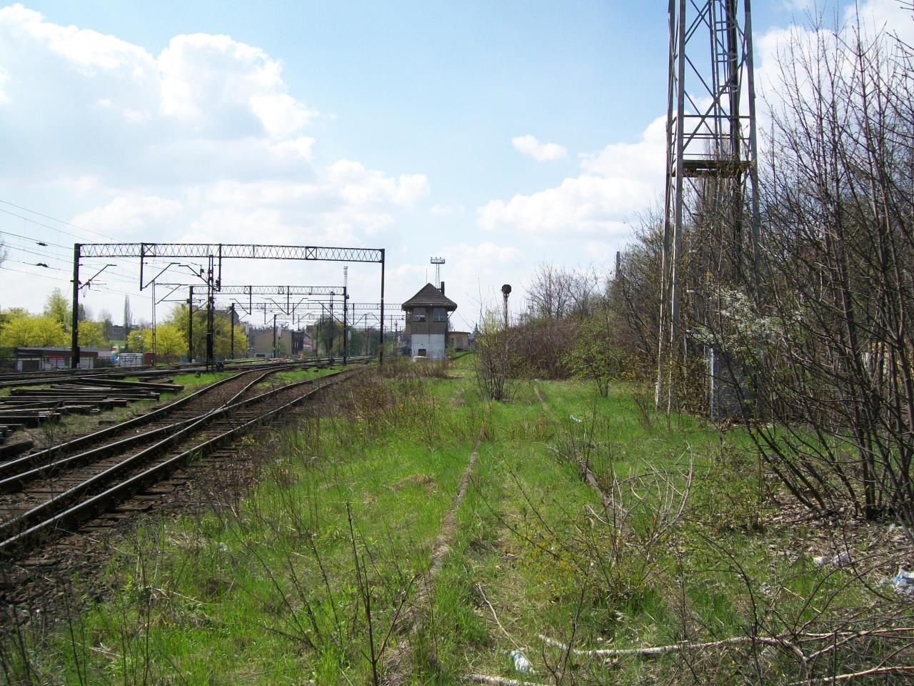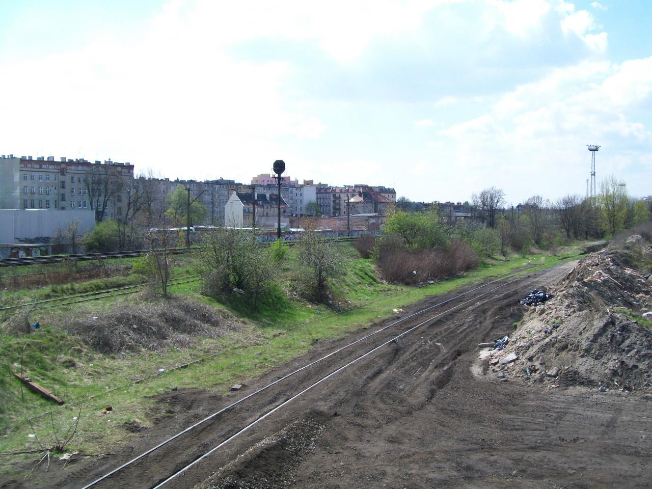 Teren placów ładunkowych w północno-wschodniej części stacji pomiędzy ulicami Rychtalską, Browarną i torami kolejowymi z Wrocławia Sołtysowic. Od prawej widoczne w kadrze: place i tory ładunkowe (częściowo zasypane pryzmami urobku ziemnego), tor łączący teren placów i bocznic ze stacją towarową, tor wyciągowy z widocznym masztem tarczy rozrządowej, zelektryfikowane tory z Sołtysowic. Za nasypem widoczny teren po dawnych zakładach przemysłowych zlokalizowanych wzdłuż ul. Ustronie (m.in. bazy remontowej urządzeń wiertniczych). Widok w kierunku południowym.