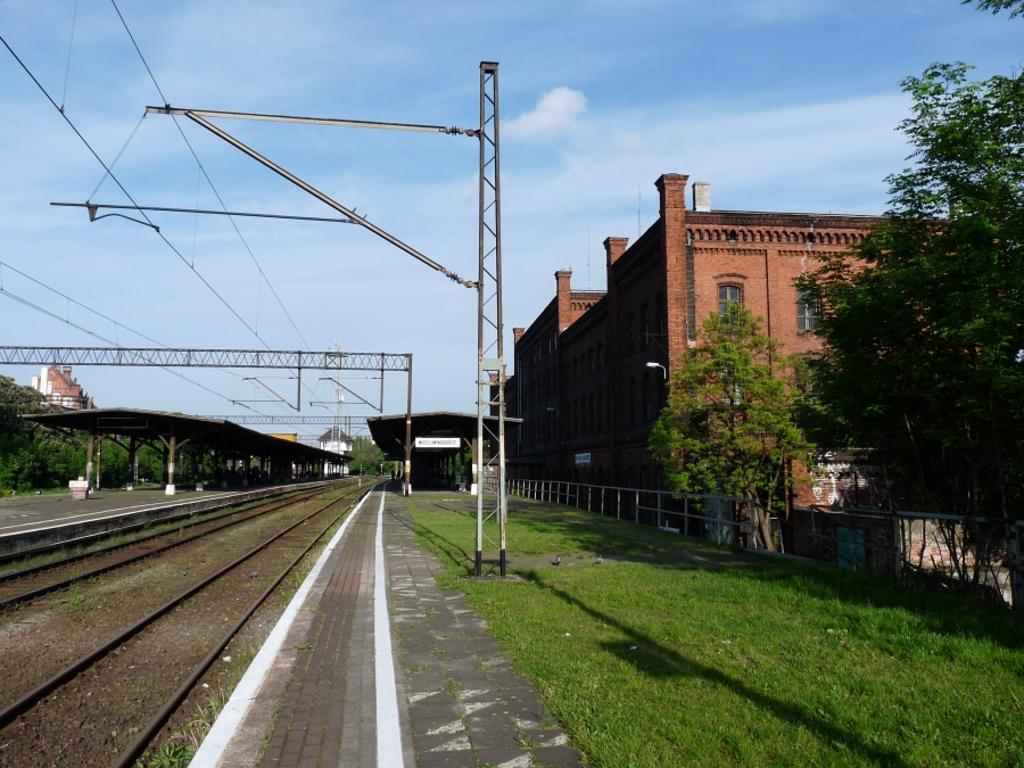 Dworzec Nadodrze widok w kierunku zachodnim (Popowice i Mikołajów). Na pierwszym planie stojący na peronie 2 budynek nastawni dysponującej WN.