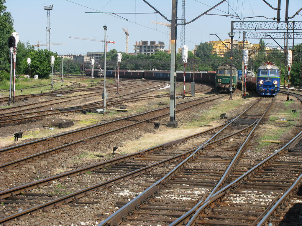 Równia stacyjna z grupą torów nieparzystych, widok z peronów od strony nastawni dysponującej. Lokomotyw ET 22 w nowym malowaniu stoi na torze nr 3, zielona ET 22 na torze nr 5.