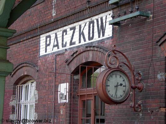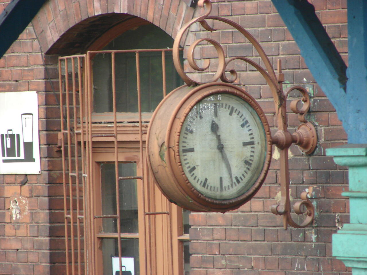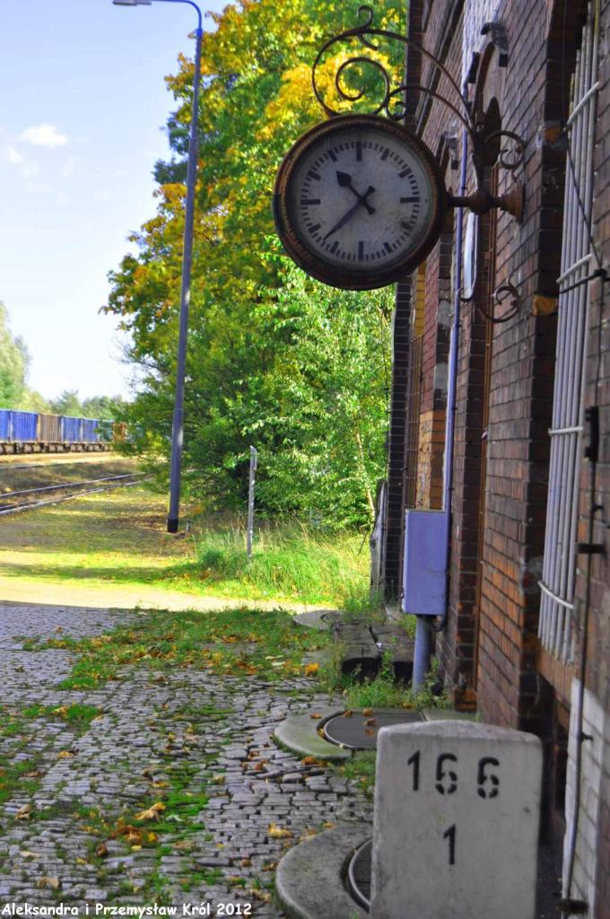 Zegar stacyjny na budynku dworca, widok w kierunku wschodnim (Otmuchów i Nysa).