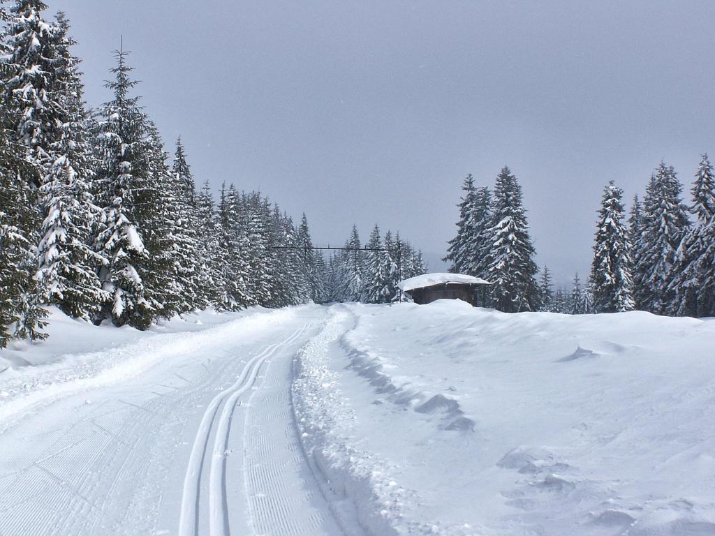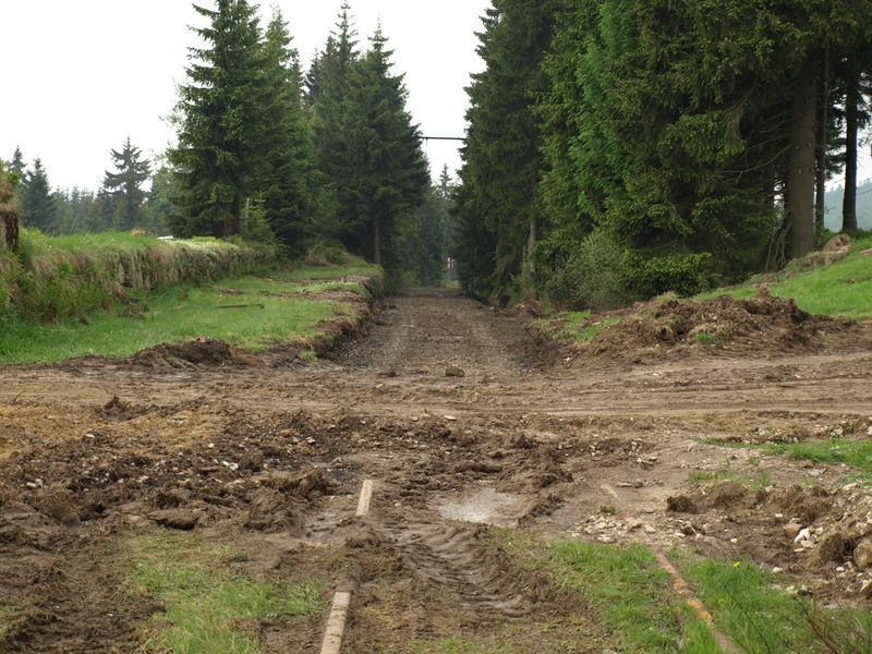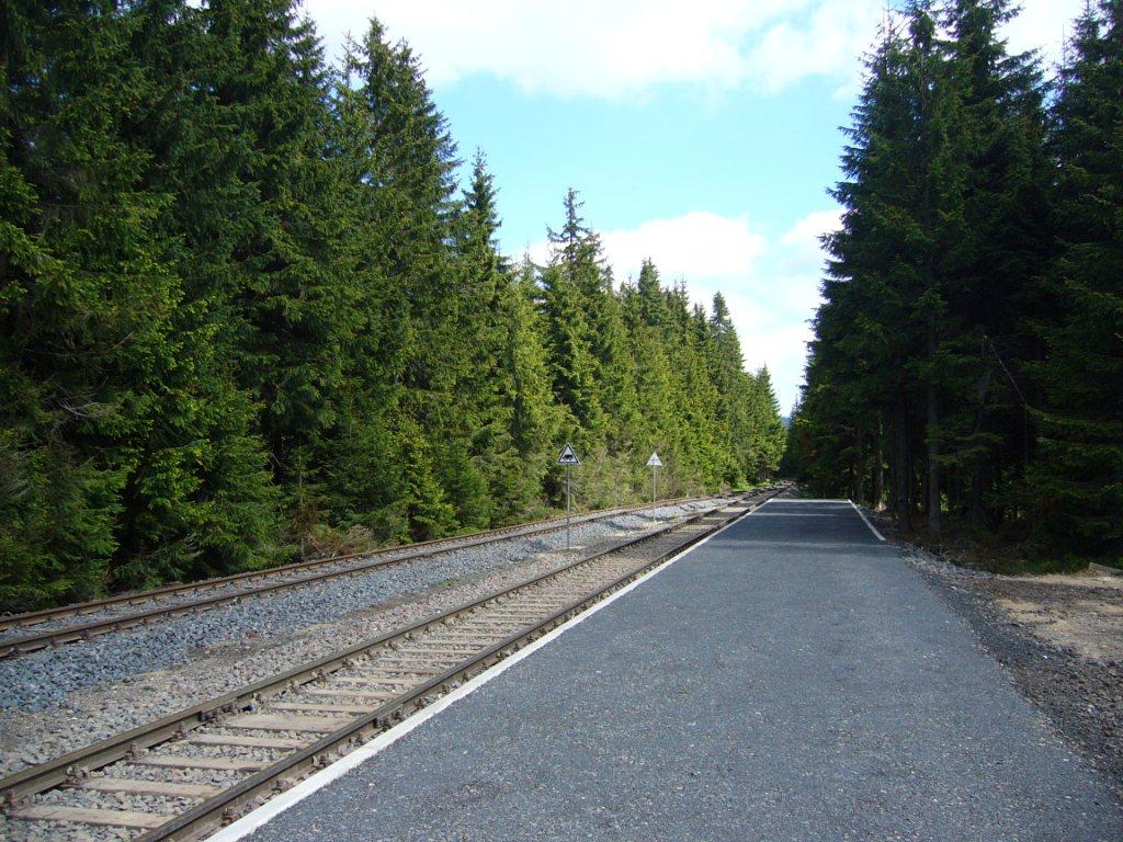 Z szutrowej ścieżki dla pieszych wyłazi jeszcze dawne torowisko stacji. Widok od strony Szklarskiej Poręby Górnej/Jeleniej Góry.