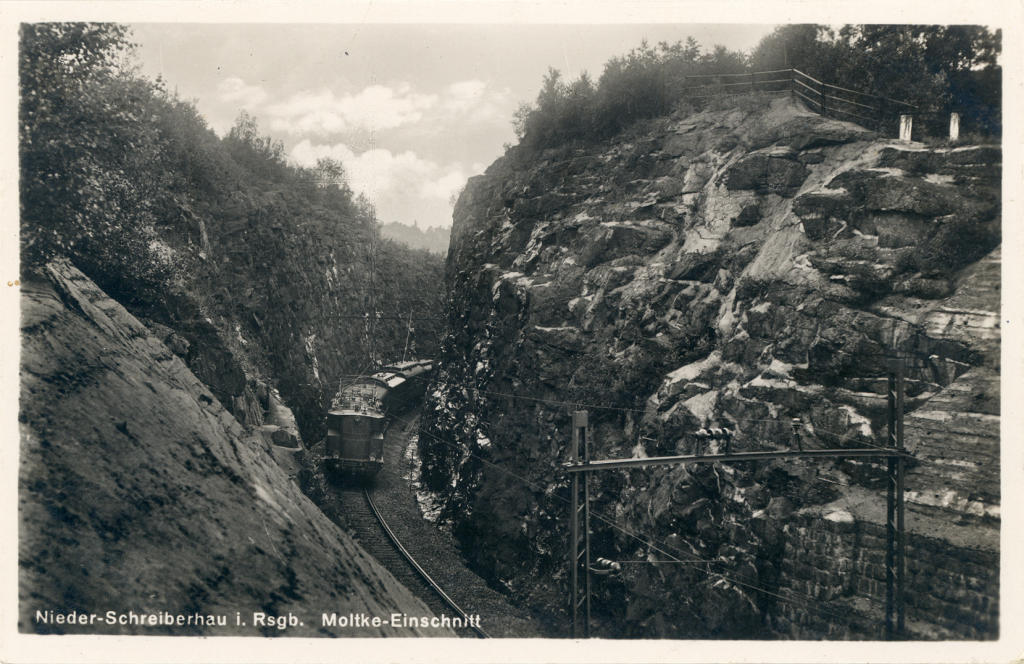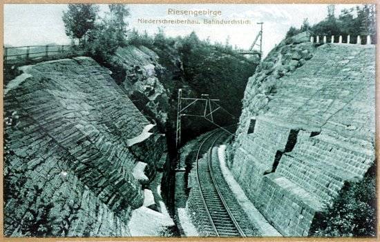 Wjazd pociągu na stację Szklarska Poręba Dolna od strony Szklarskiej Poręby Średniej; widok tamże (zachód). Sztuczny wąwóz przebity przez skałę celem przeprowadzenia toru.