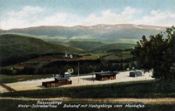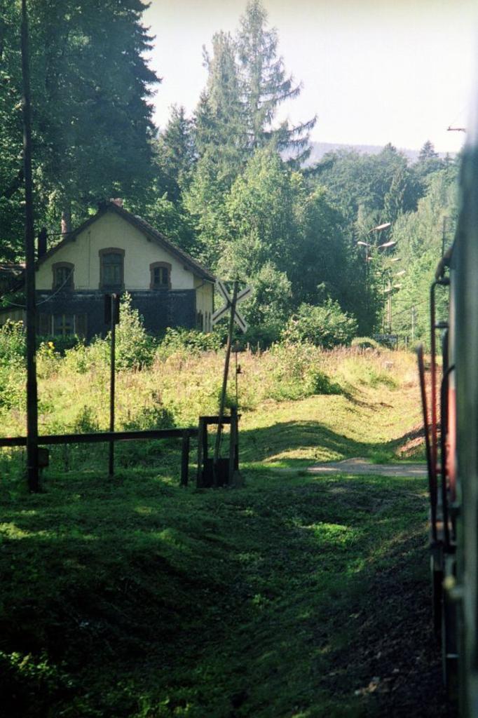 Wjazd na stację Szklarska Poręba Dolna (widoczny stojący na grani semafor) od strony Szklarskiej Poręby Średniej; widok tamże (zachód). Sztuczny wąwóz przebity przez skałę celem przeprowadzenia toru.
