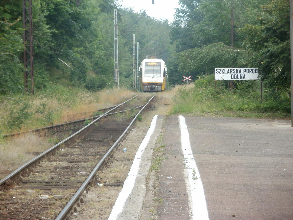 Na stację wjeżdża pociąg Osobowy KD Jelenia Góra-Szklarska Poręba Górna.