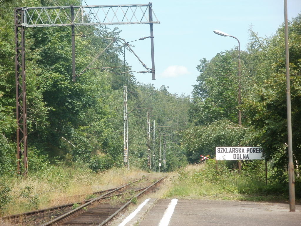 Szklarska Poręba Dolna - peron i zarośnięty tor dodatkowy. Widok od strony wjazdu z Jeleniej Góry.