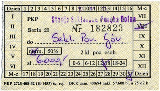 Bilet na przejazd Szklarska Poręba Dolna - Szklarska Poręba Górna z dnia 31. 08. 1994.