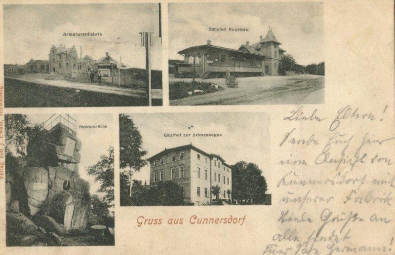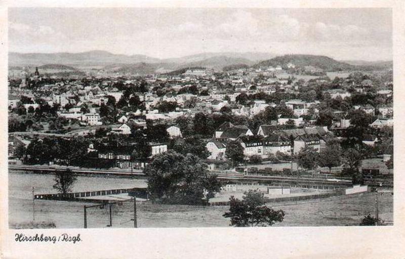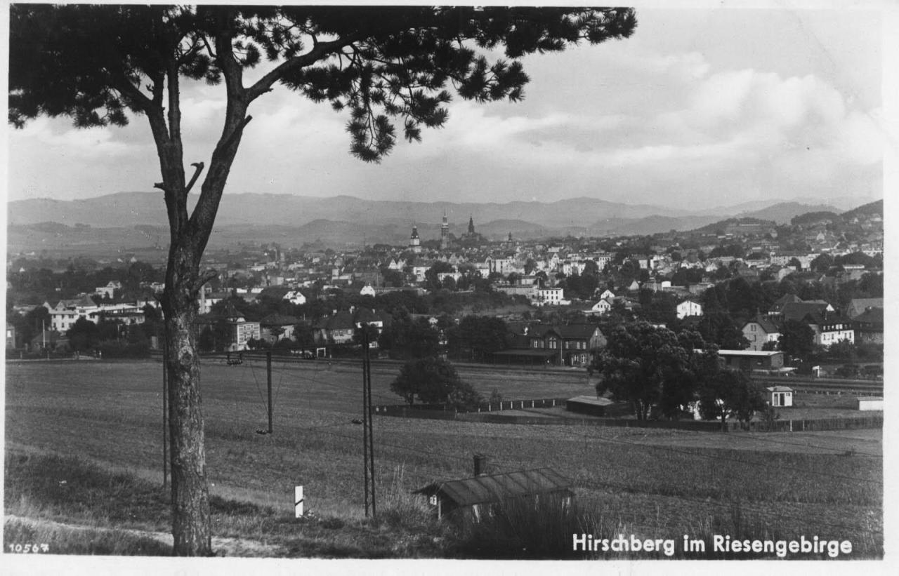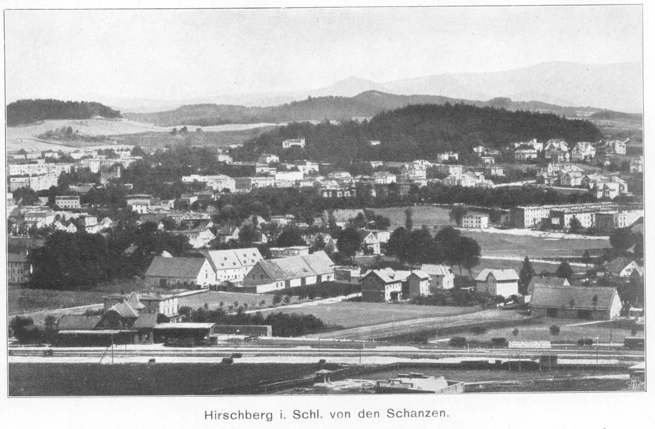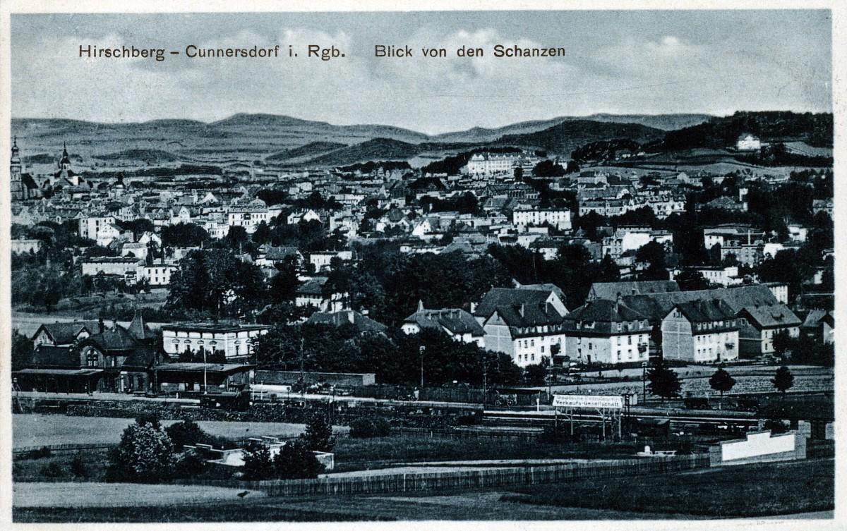 Stacja kolejowa u dołu kadru; z lewej strony dworzec i magazyn towarowy widoczne od strony peronów. W lewo stacja Jelenia Góra, w prawo Szklarska Poręba. Stara pocztówka ze zbiorów Adama Pacześniaka.