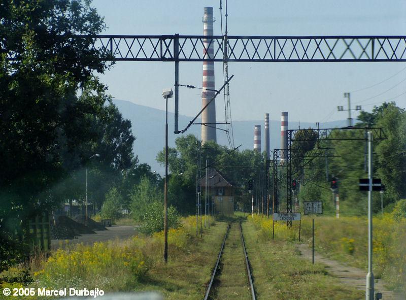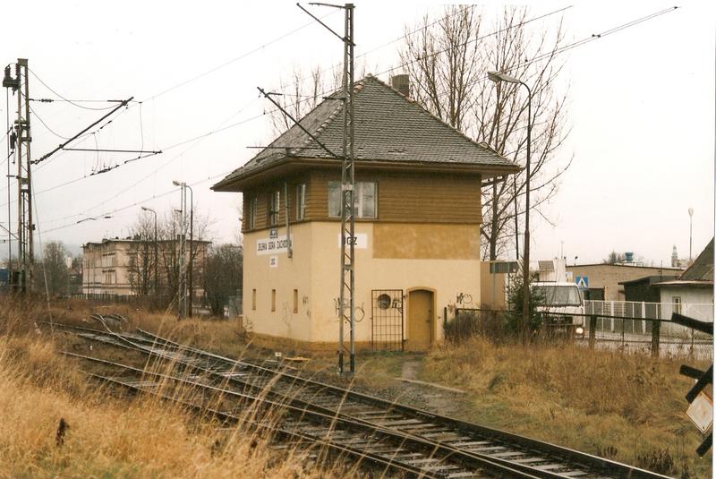Jelenia Góra Zachodnia. Widok w kierunku Szklarskiej Poręby. W tle nastawnia i kominy Jelchemu, dawnej Celwiskozy.