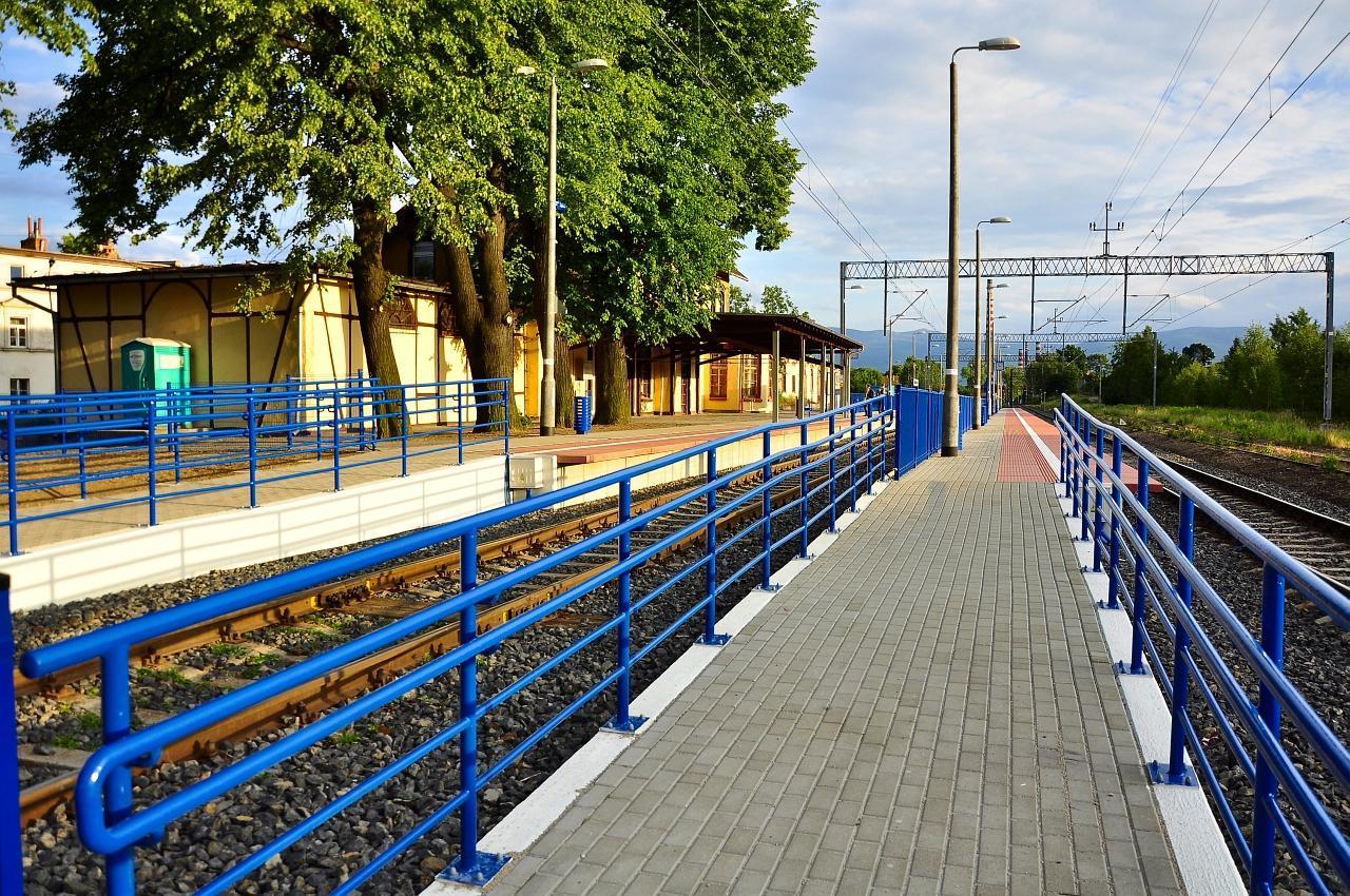 Widok na perony od strony stacji Jelenia Góra. Z lewej, w tle budynek dworca.