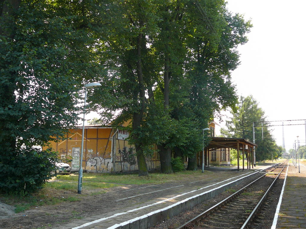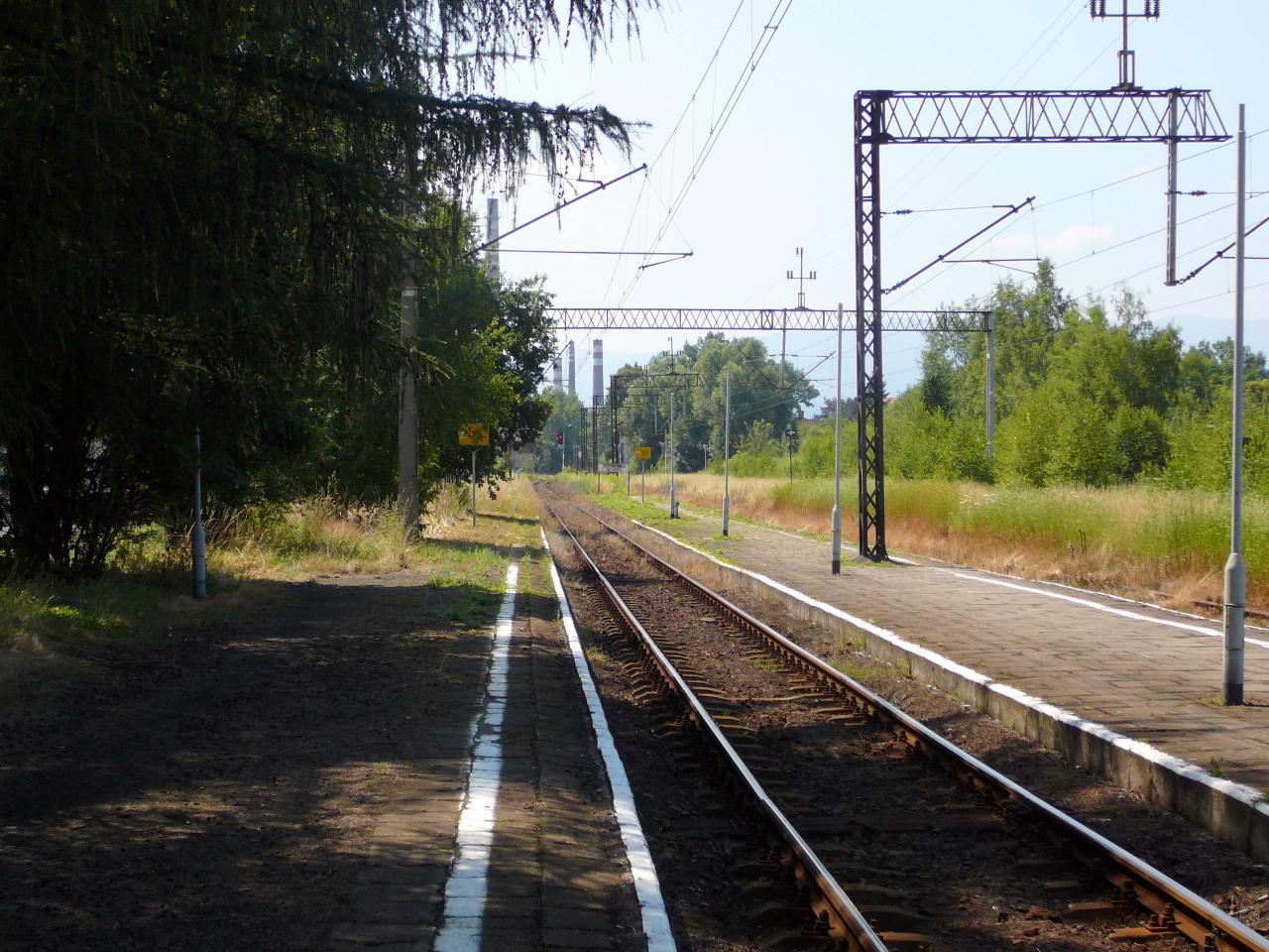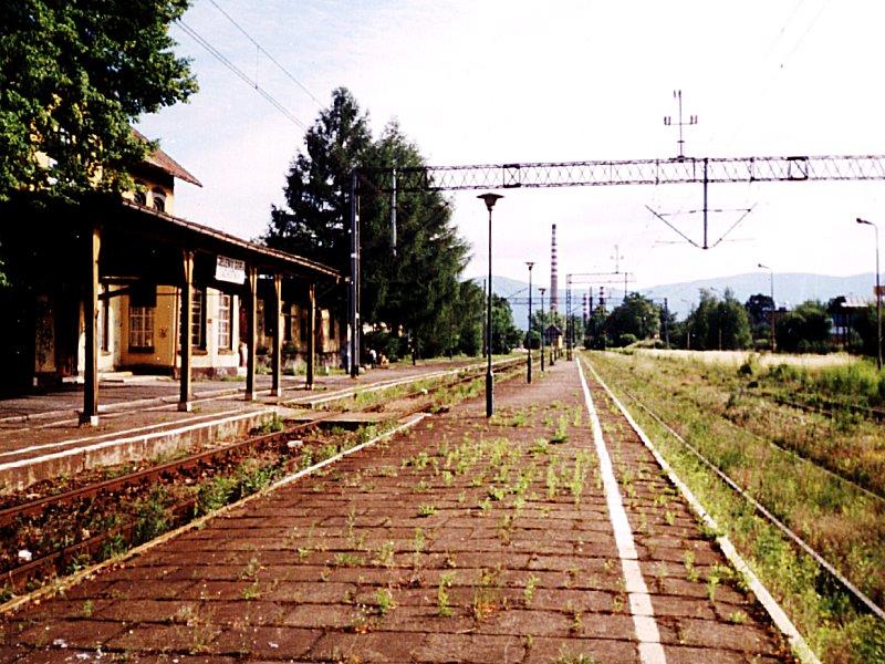 Widok na perony w kierunku Szklarskiej Poręby. Z lewej budynek dworca, w tle komin dawnej Celwiskozy.