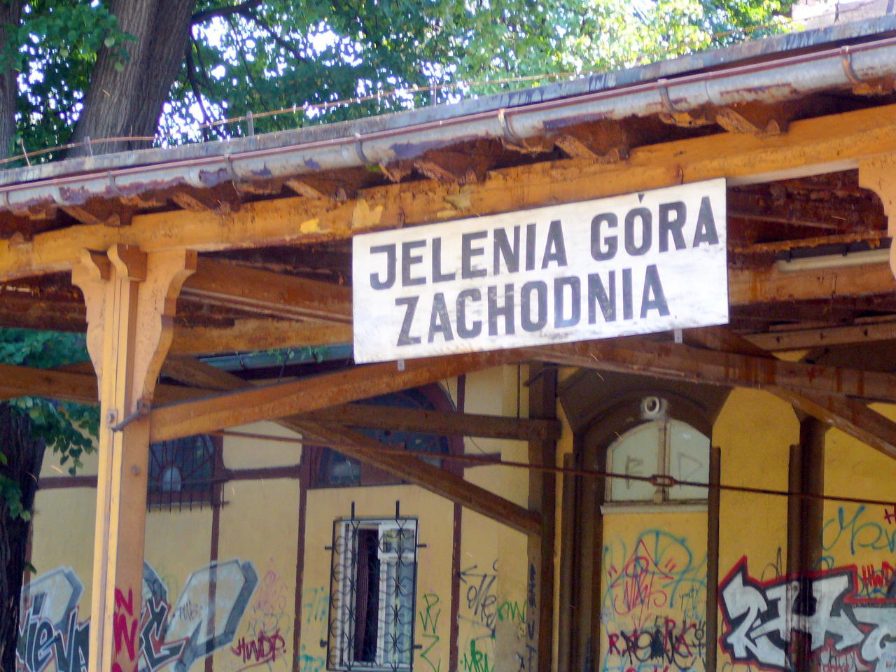 Jelenia Góra Zachodnia. Nazwa stacji pod dziurawą rynną.