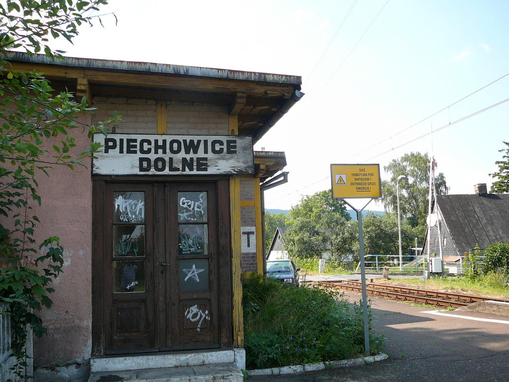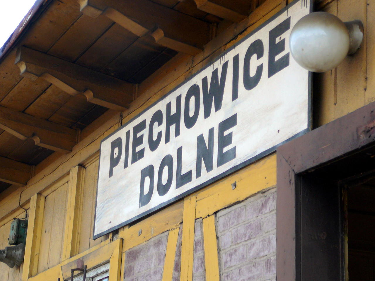 Piechowice Dolne. Nazwa stacji nad wejściem do budynku dworca.
