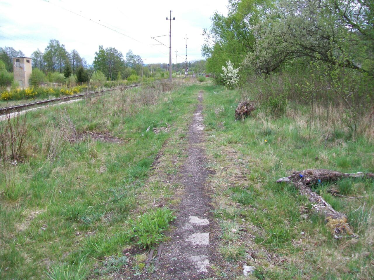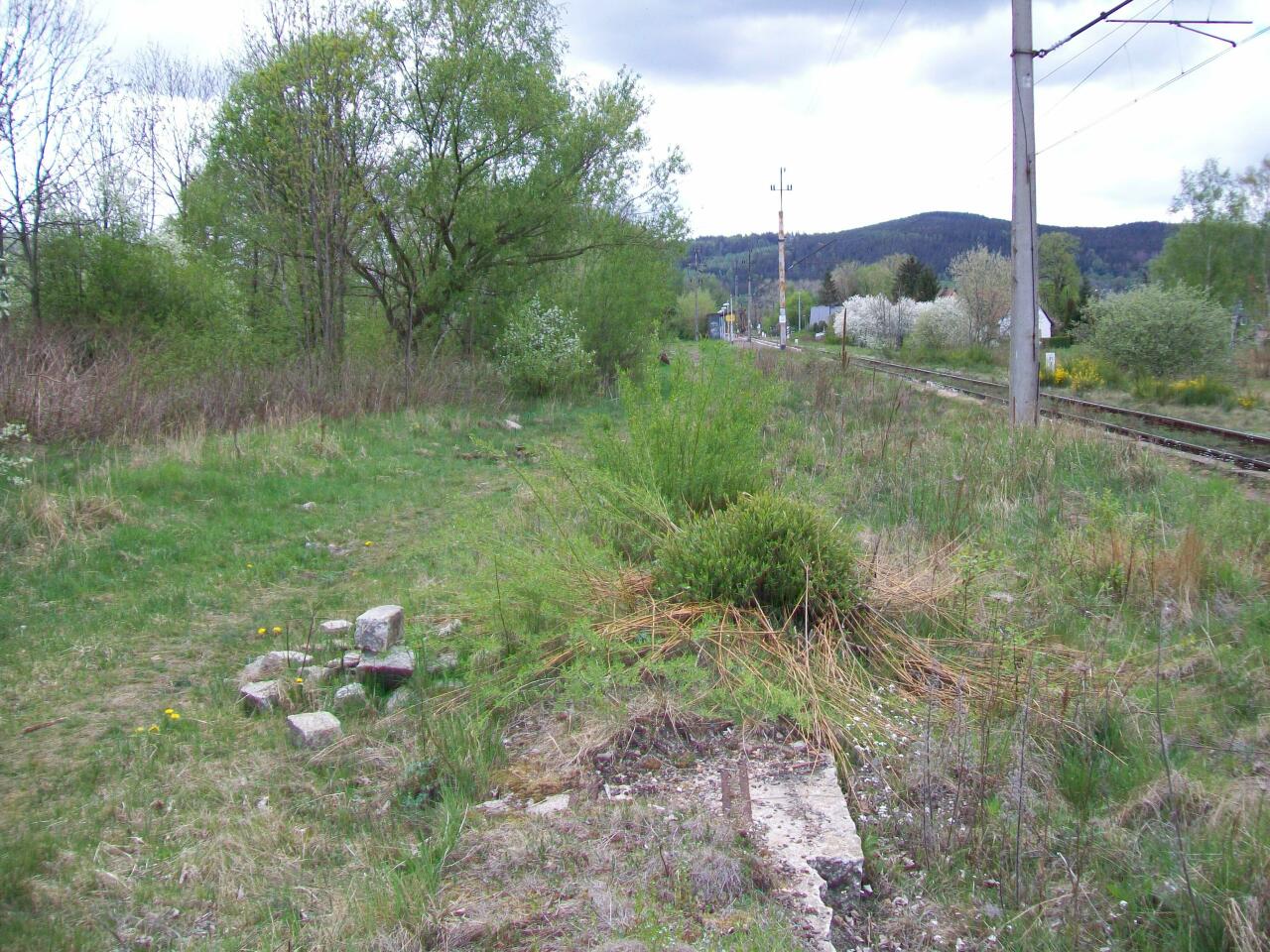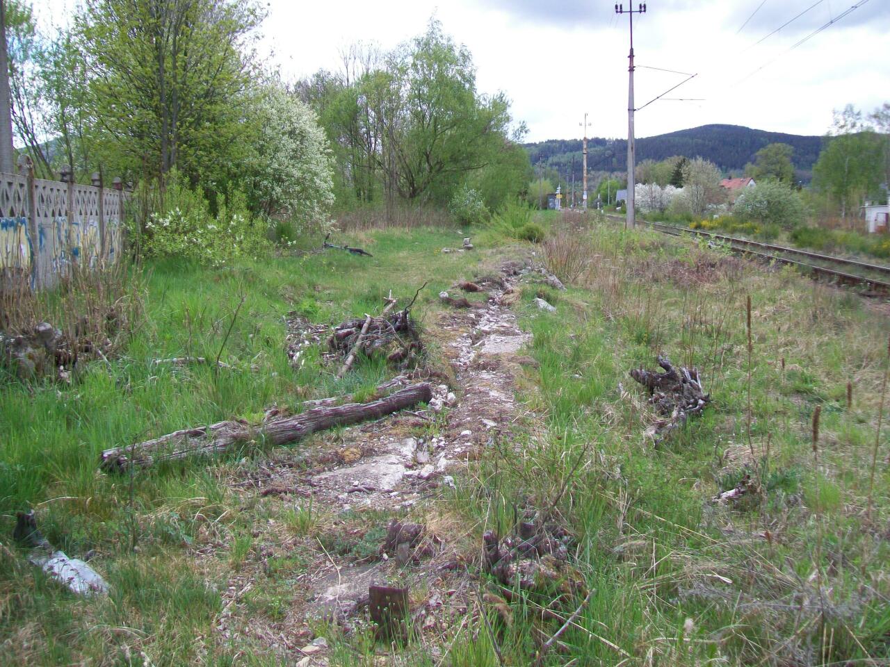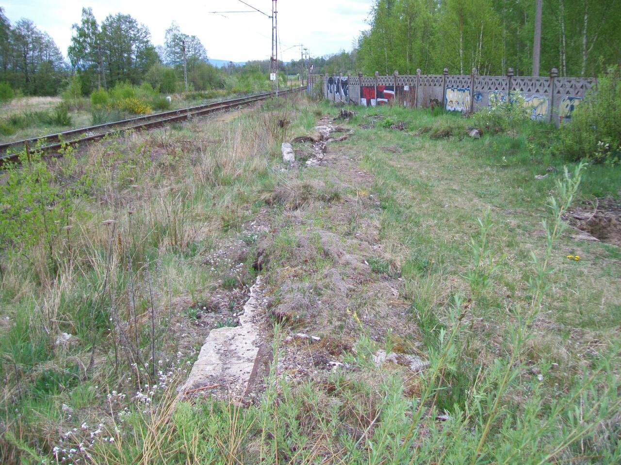 Koniec toru wąskiego, który biegł wzdłuż toru szlakowego do Jeleniej Góry (z prawej). Tutaj znajdował się niewielki kozioł oporowy (widoczne resztki). Z lewej strony, za betonowym płotem, teren dawnej "Karelmy". Widok w kierunku zachodnim (peron).