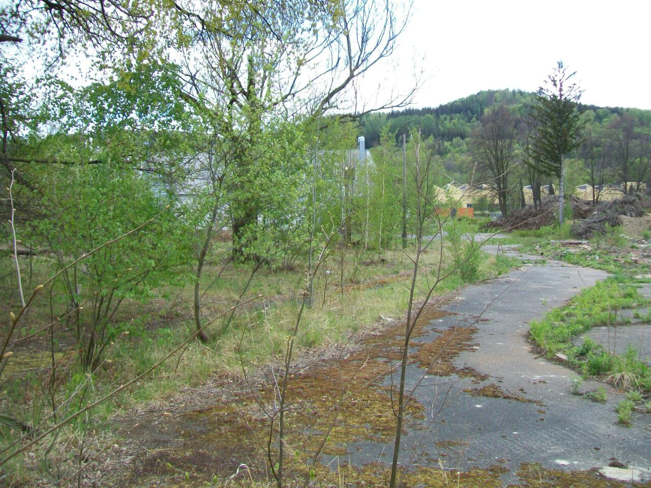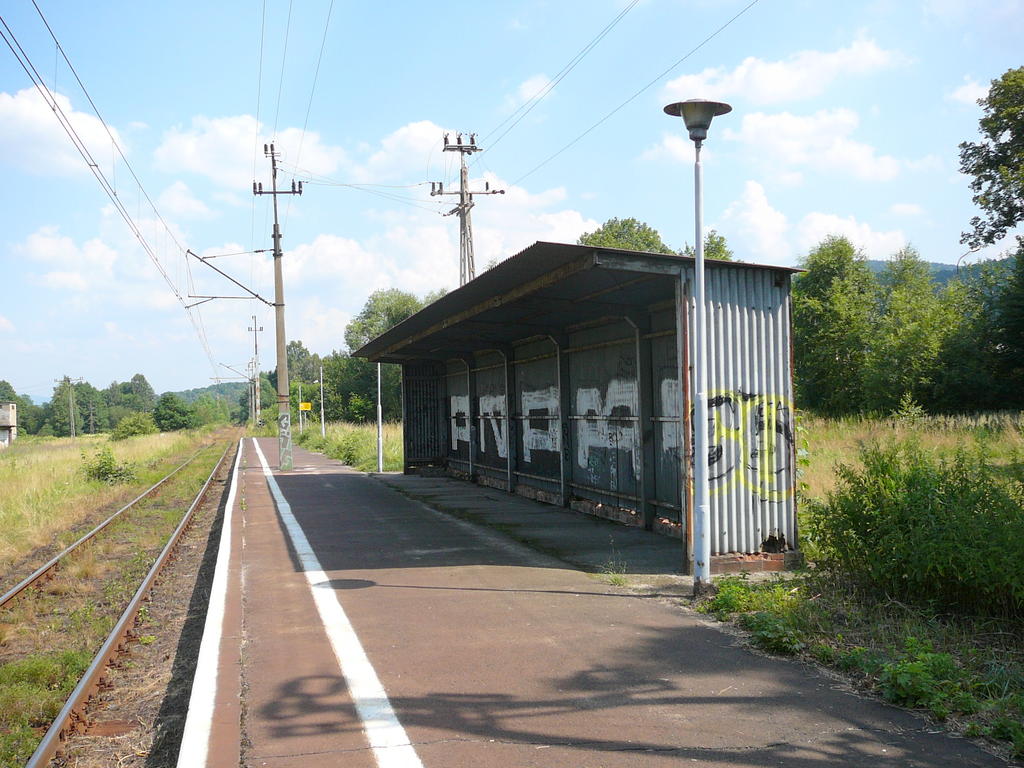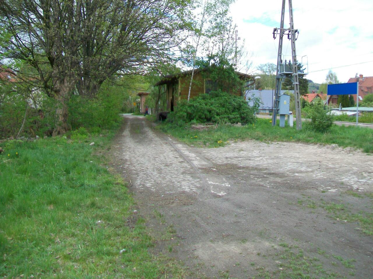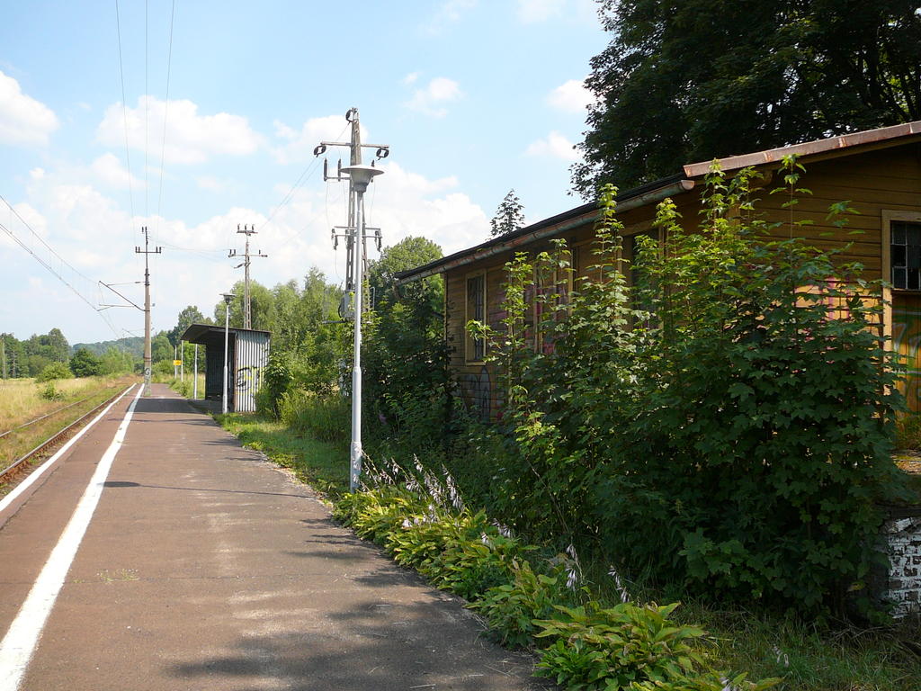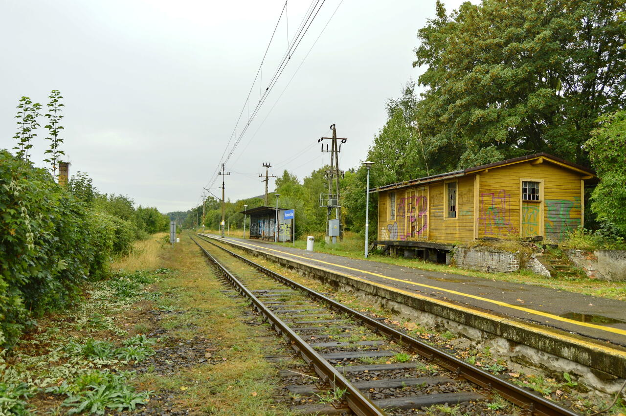 Koniec toru wąskiego, który biegł wzdłuż toru szlakowego do Jeleniej Góry (z prawej). Tutaj znajdował się niewielki kozioł oporowy (widoczne resztki). Z lewej strony, za betonowym płotem, teren dawnej "Karelmy". Widok w kierunku zachodnim (peron).