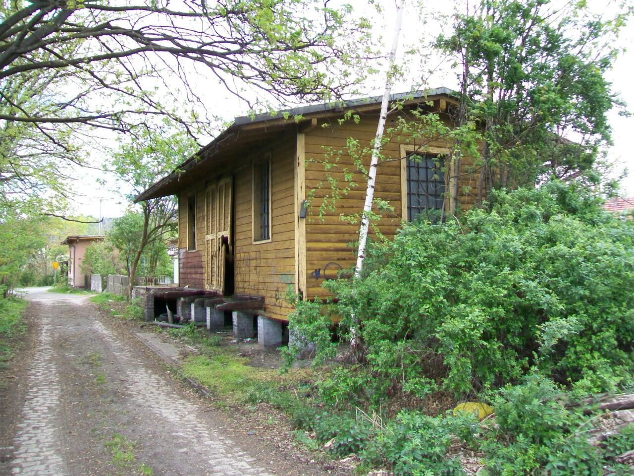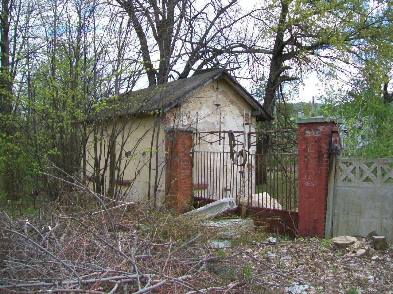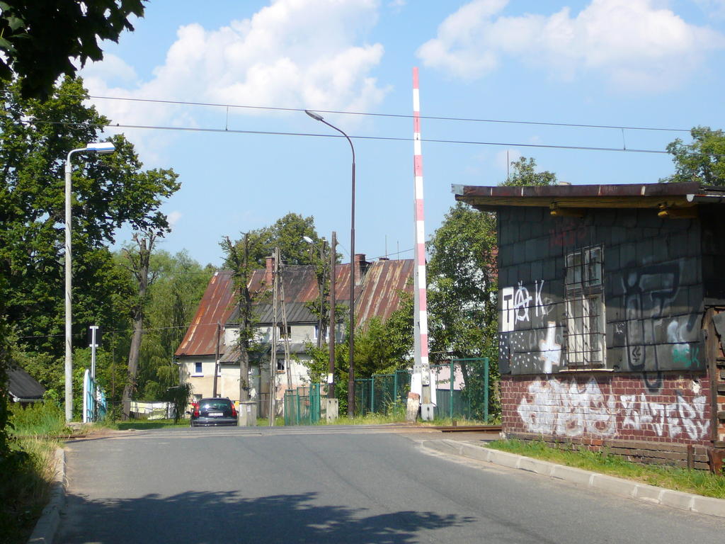 Jest to brama wjazdowa na teren dawnej "Karelmy", przez którą najprawdopodobniej przechodził tor wąski, obsługujący zakład, zanim wybudowano bocznicę normalnotorową. Widok w kierunku południowo-wschodnim (za plecami peron).