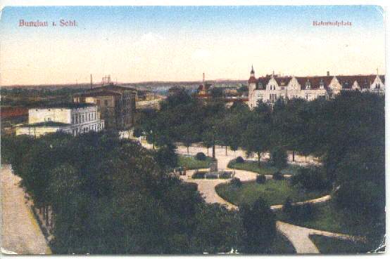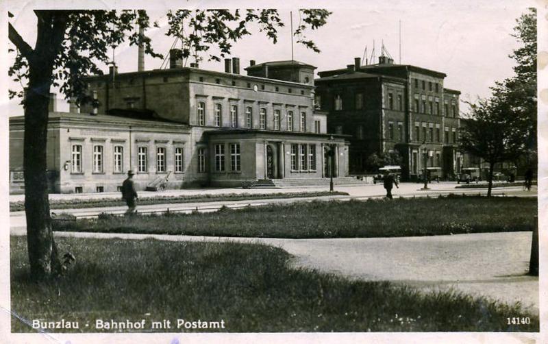 Stara widokówka z widokiem na dworzec od strony miasta w kierunku wschodnim (Chojnów).