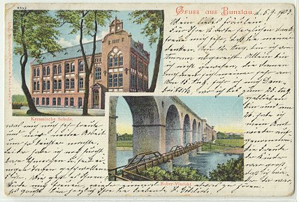 Stara pocztówka. Most nad Bobrem w Bolesławcu. Widok w kierunku wschodnim (perony stacji Bolesławiec).