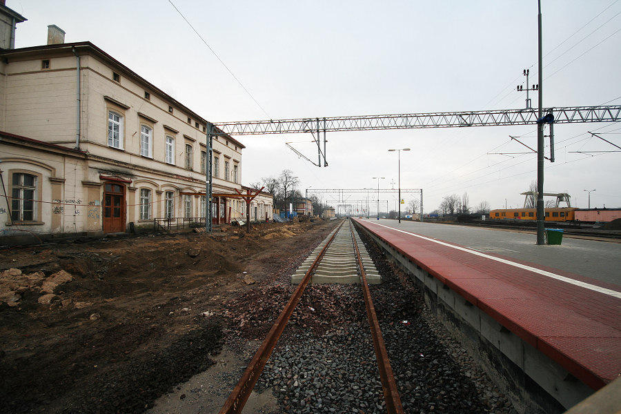 Modernizacja stacji. Z prawej nowy, jeszcze niezadaszony peron 2, z lewej powstający peron 1 i budynek dworca. Widok w kierunku zachodnim (Zebrzydowa/Węgliniec).