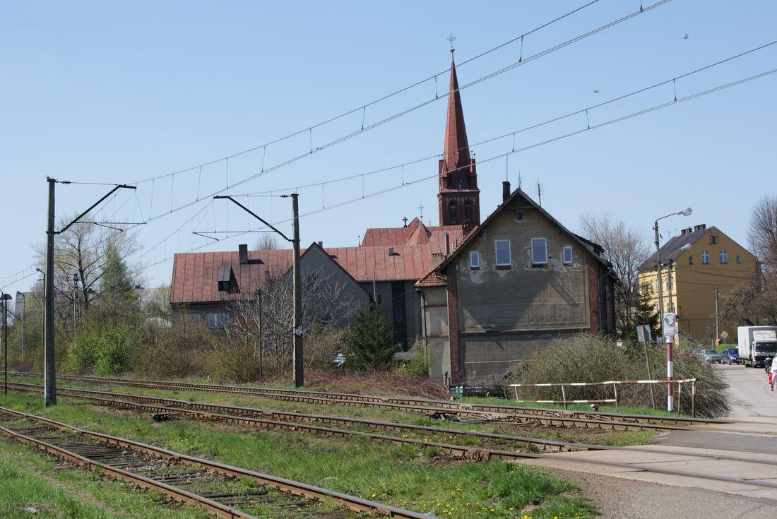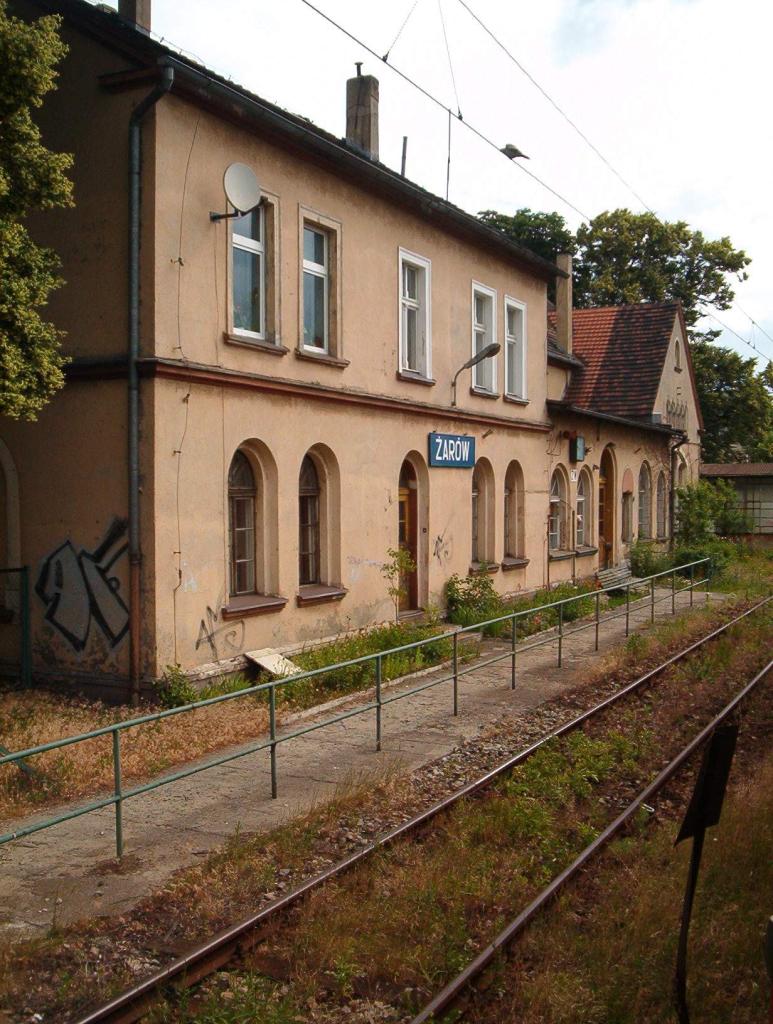 Fragment przejazdu przez ul. Adama Mickiewicza w Żarowie. Z przodu tor prowadzący do firmy TOM, zajmującej się obrotem surowcami wtórnymi. Dwa tory pod drutem to wjazd z Wrocławia. W lewo perony, w prawo wyjazdy. W tle wieża kościoła Najświętszego Serca Pana Jezusa. Widok w kierunku północno-zachodnim.