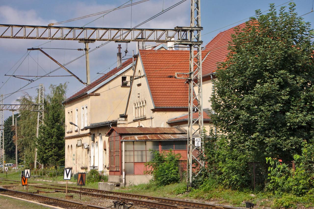 Dworzec kolejowy z 1912 r. W planach jest remont obiektu. Mieści się w nim także nastawnia dysponująca, na parterze, tam gdzie okna z firankami. Widok z peronu, od strony Jaworzyny Śląskiej.