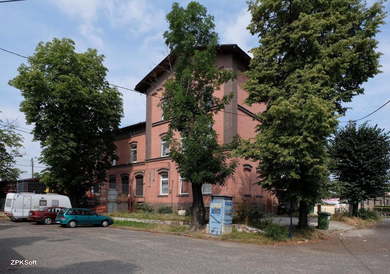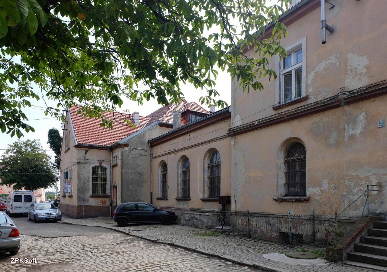 Widok na budynek i dawny plac z bocznicami od strony miasta (od południa).