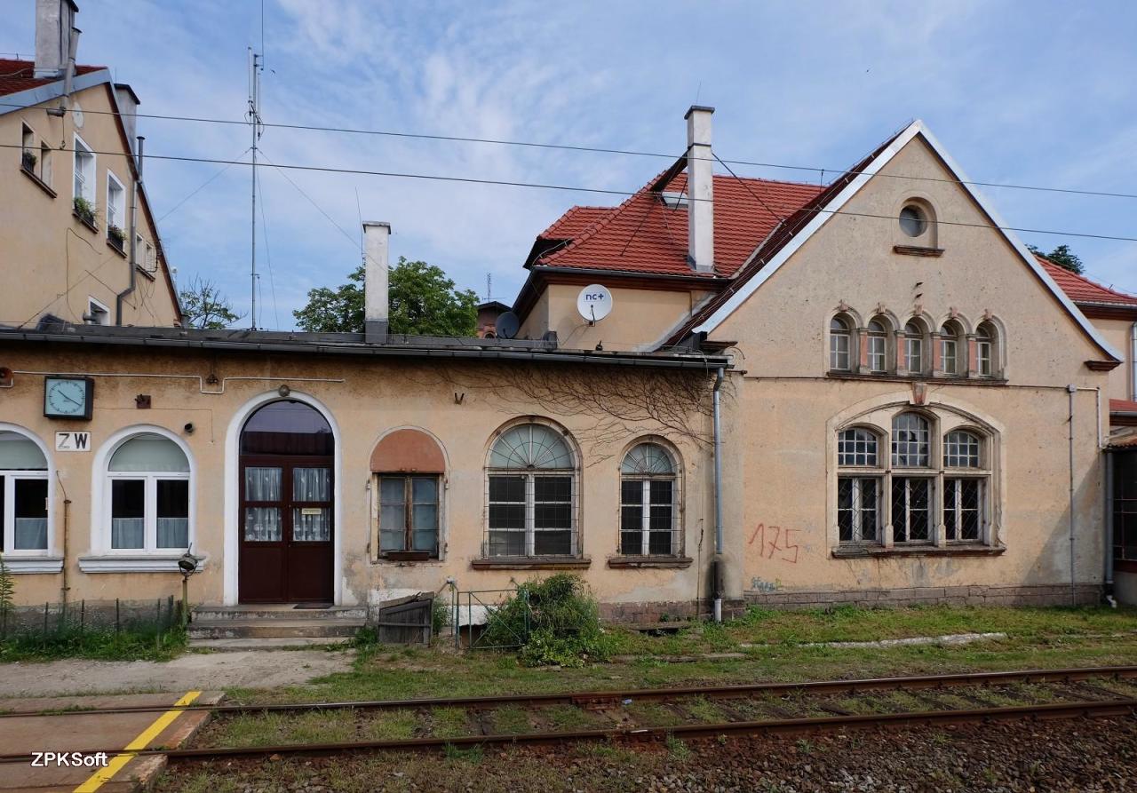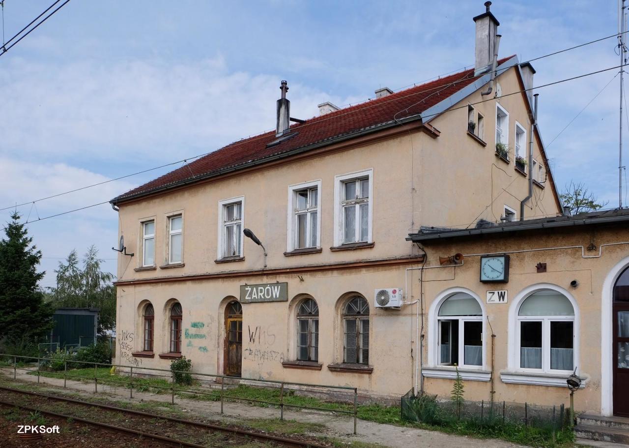 Dworzec kolejowy z 1912 r. widziany od strony torów. W planach jest remont obiektu. W oknach, za firankami znajduje się nastawnia dysponująca. W lewo Jaworzyna Śląska, w prawo Wrocław.