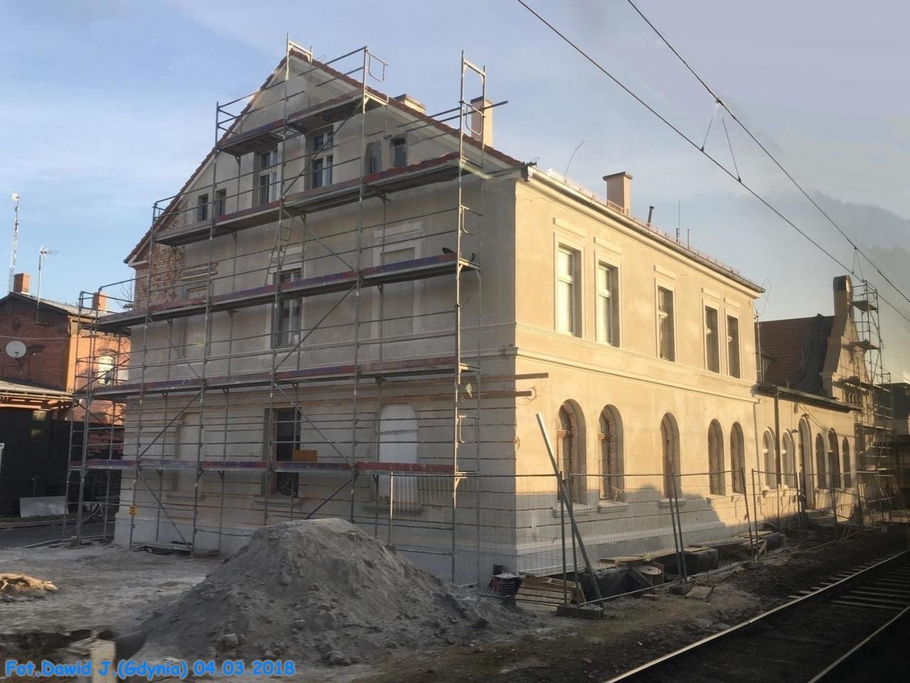Budynek dworcowy w czasie remontu. Widok w kierunku Wrocławia.