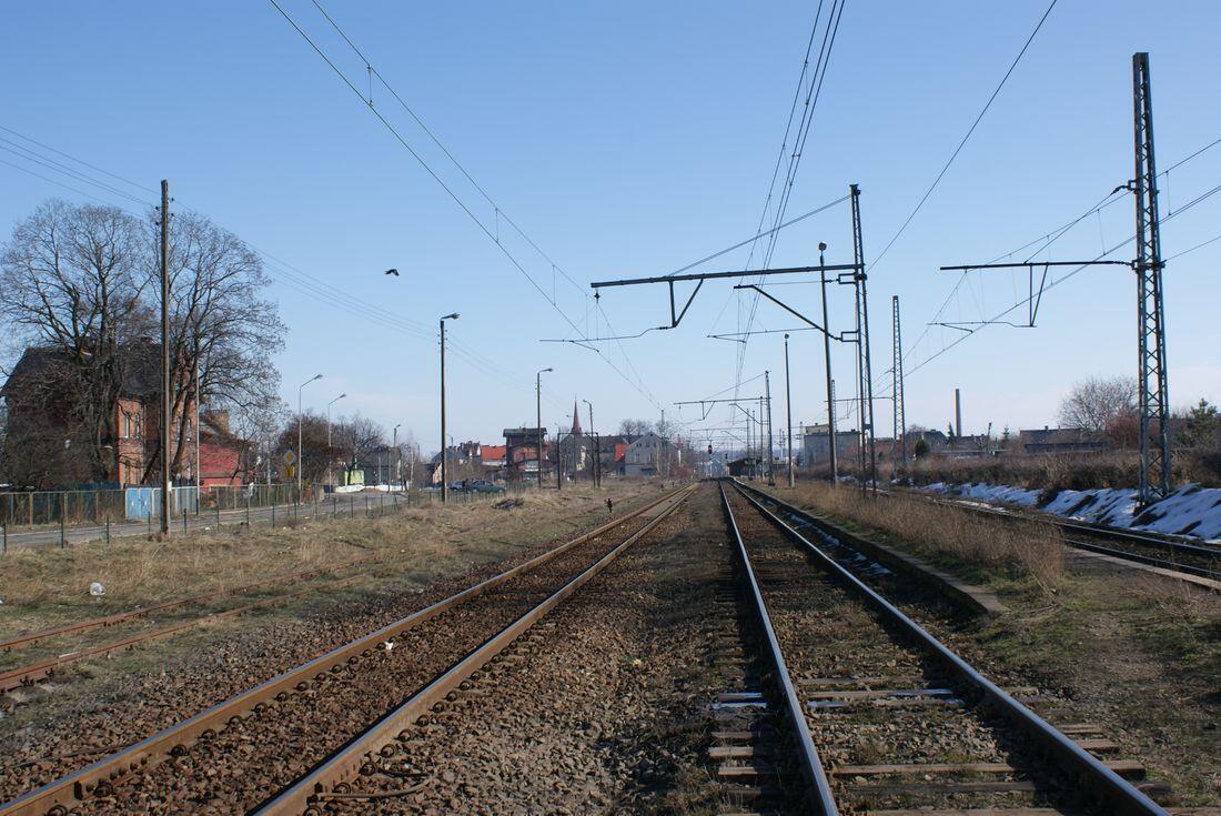Widok z przejazdu kolejowego przez ul. Dworcową w kierunku północno-wschodnim. Wjazd od strony Jaworzyny Śląskiej. W tle perony.