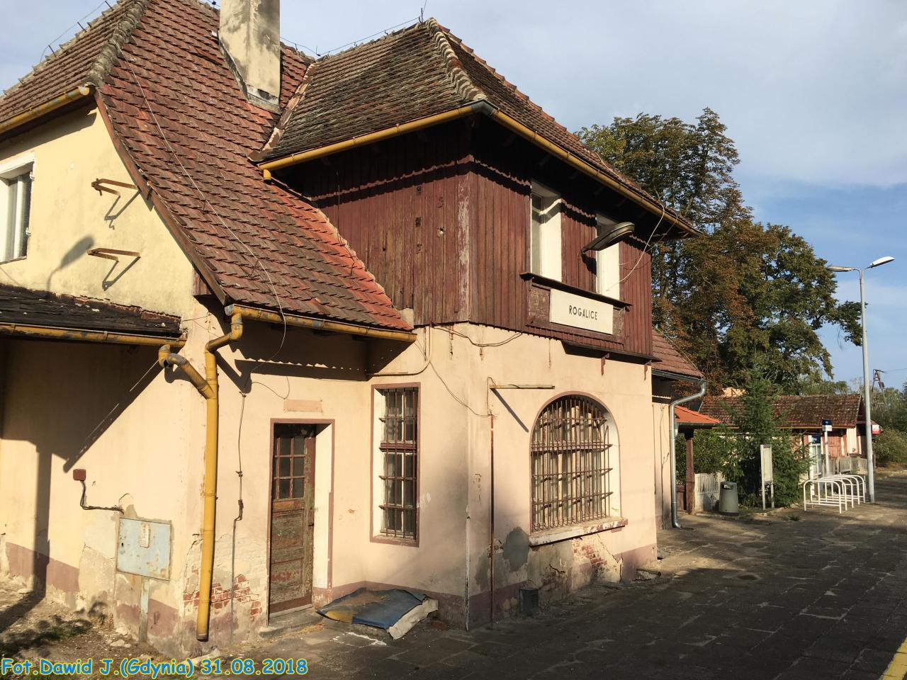 Rogalice. Budynek dworca od strony peronów: w prawo Opole, w lewo Jelcz-Laskowice/Wrocław.