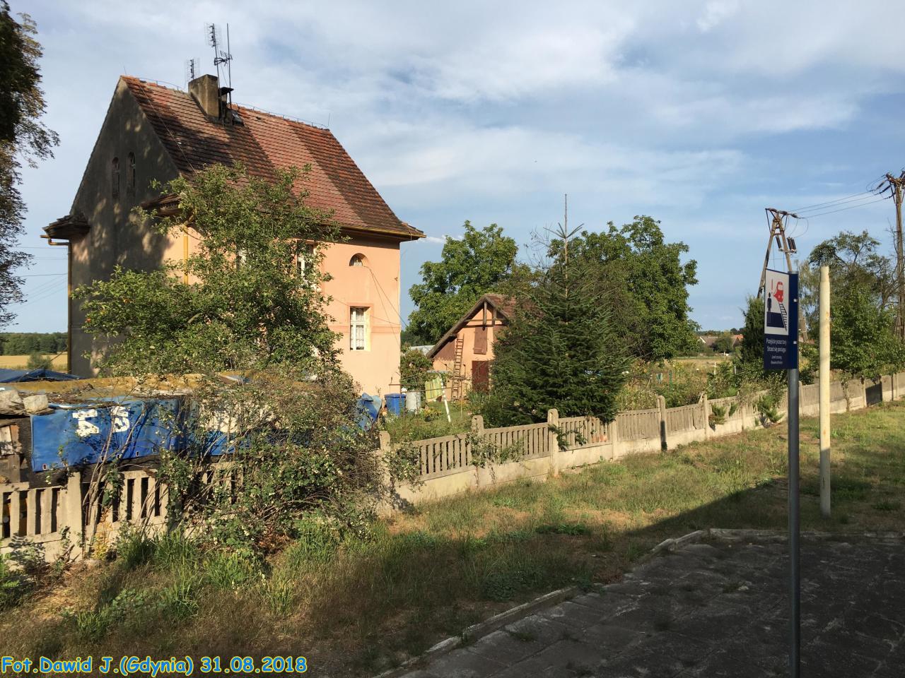 Widok z peronu 1 w kierunku Jelcza-Laskowic, Wrocławia. Kolejowy budynek mieszkalny i pobliski budynek gospodarczy, budynek WC, budynek dworcowy po prawej stronie.