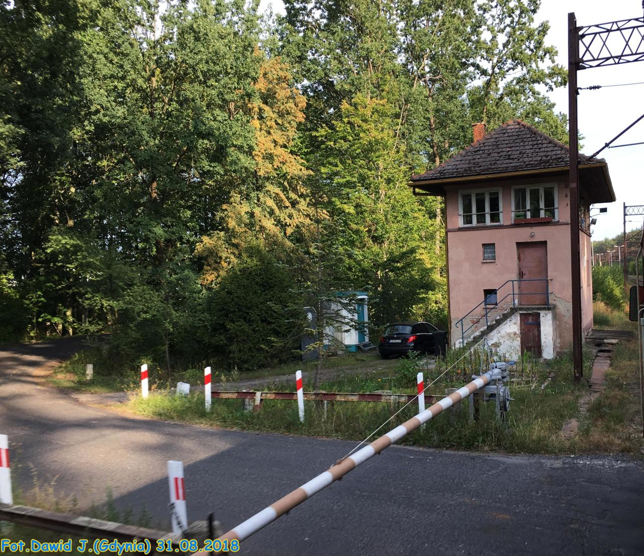 Budynek dawnej nastawni wykonawczej (obecnie strażnica przejazdowa) i rogatka podobna do tej ze stacji Reda Pieleszewo. Widok w kierunku Opola.