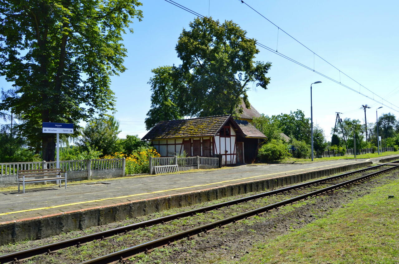 Widok z peronu 1 w kierunku Jelcza-Laskowic/Wrocławia. Tablica z nazwą stacji. Budynek WC, budynek dworcowy po prawej stronie.