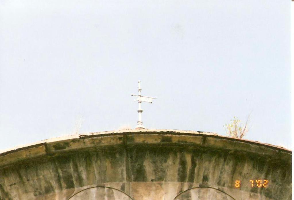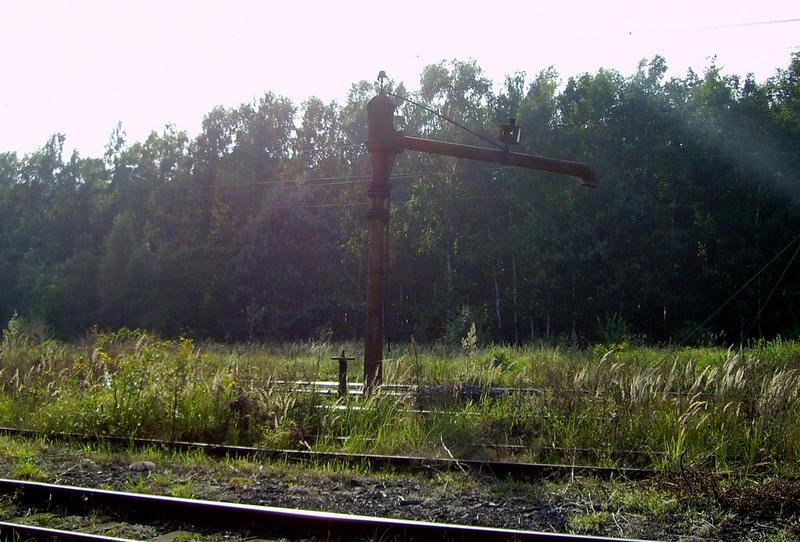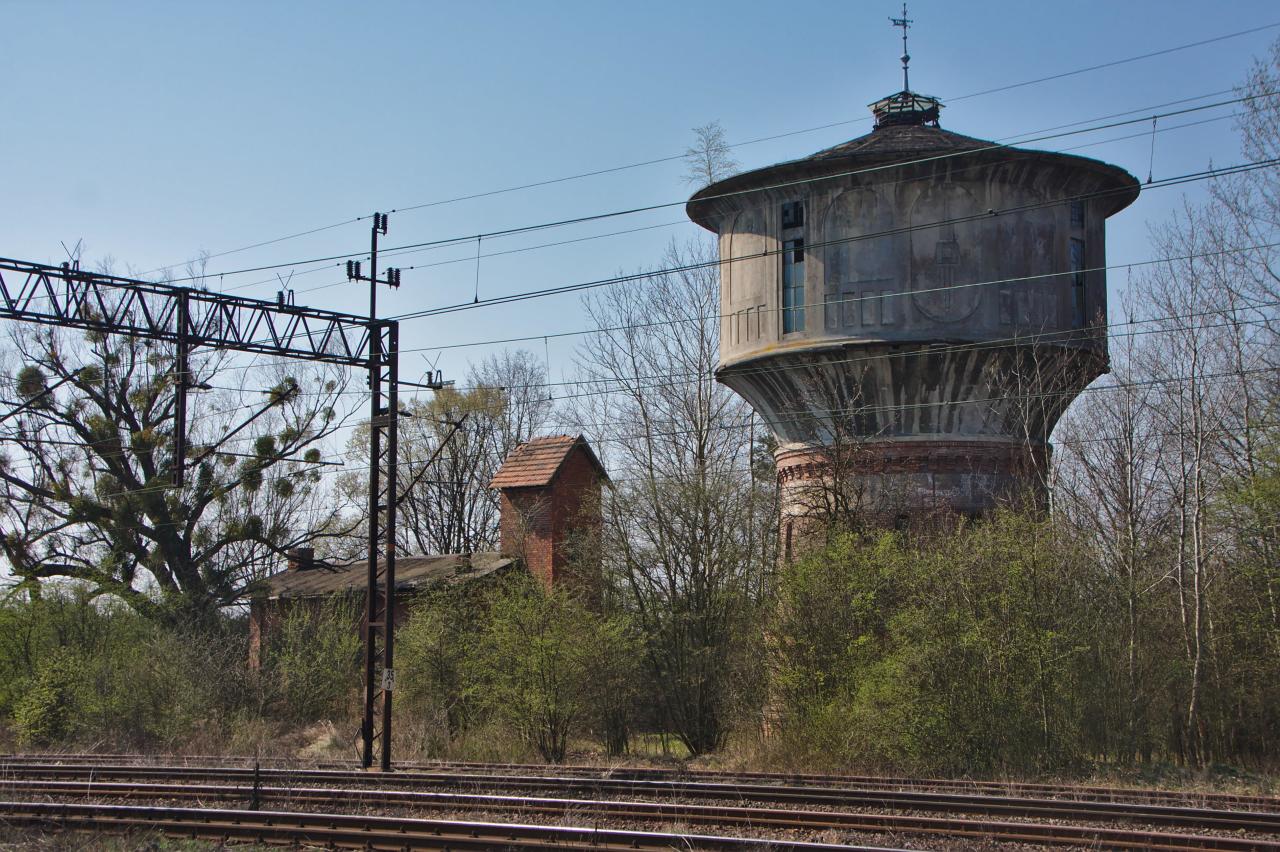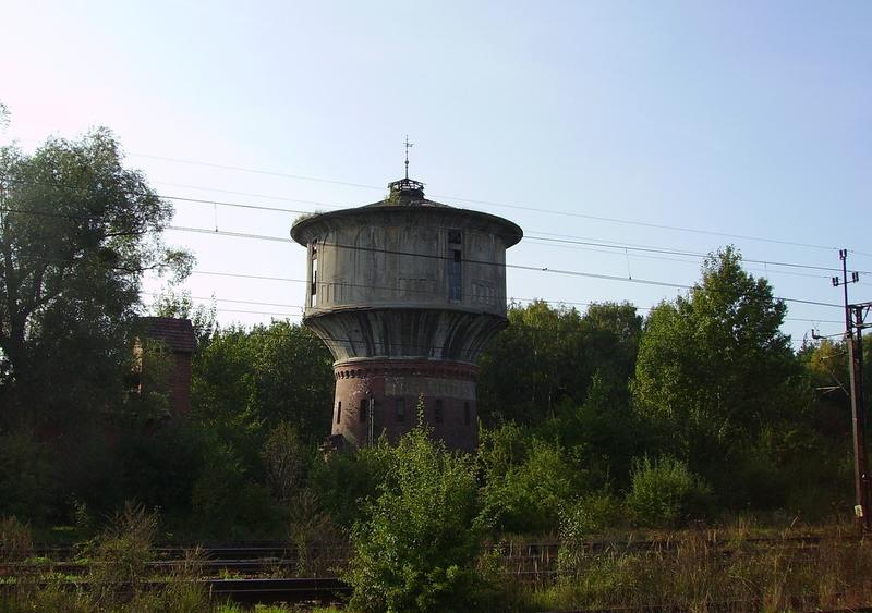 Południowa część stacji. Stojąca w krzakach Wieża wodna.