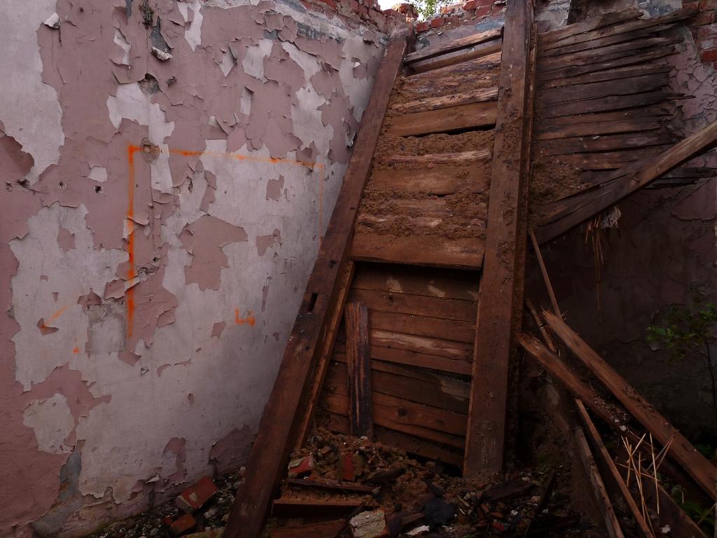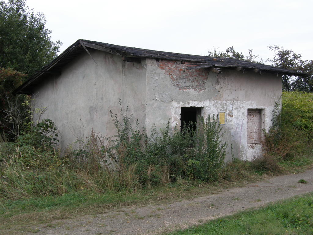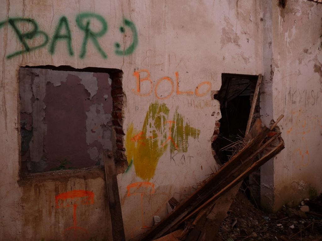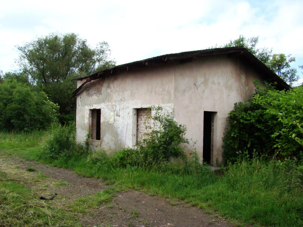 Budynek dworca stojący przy peronie 1, w stanie destrukcji.