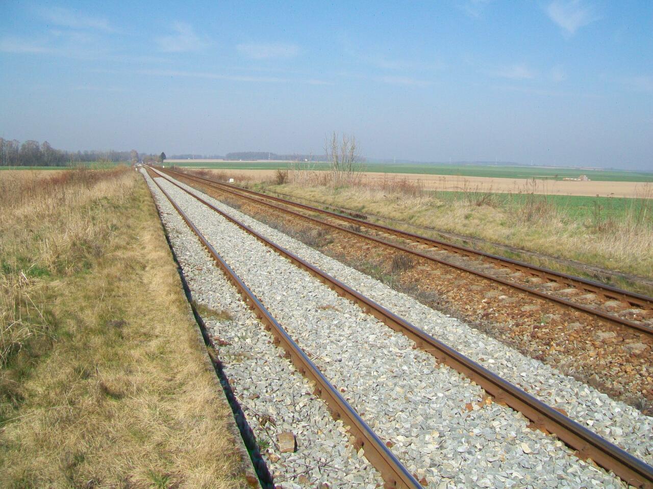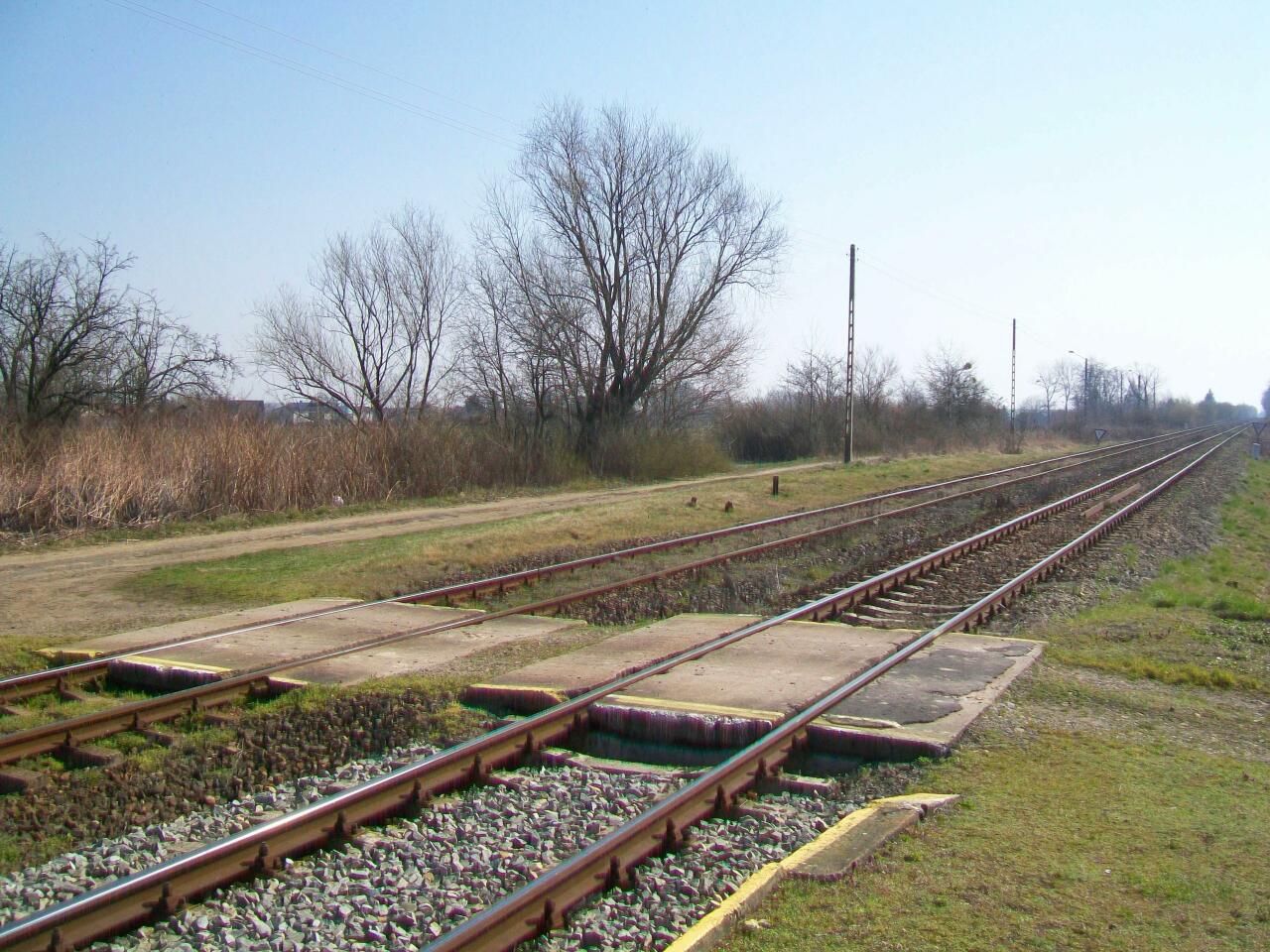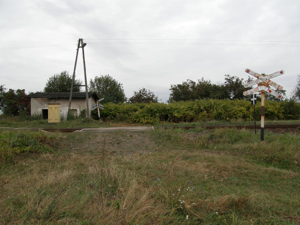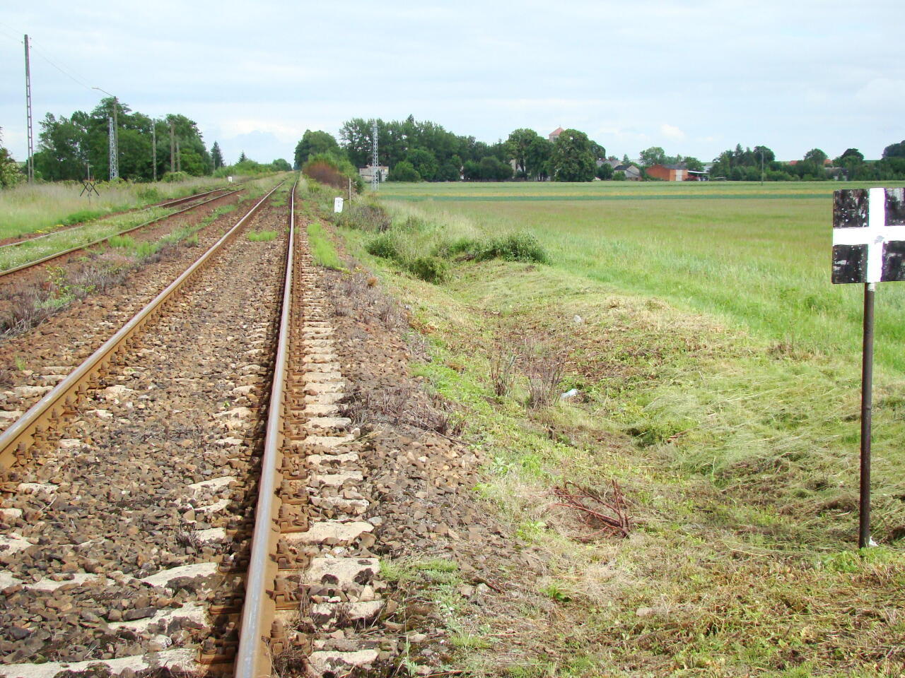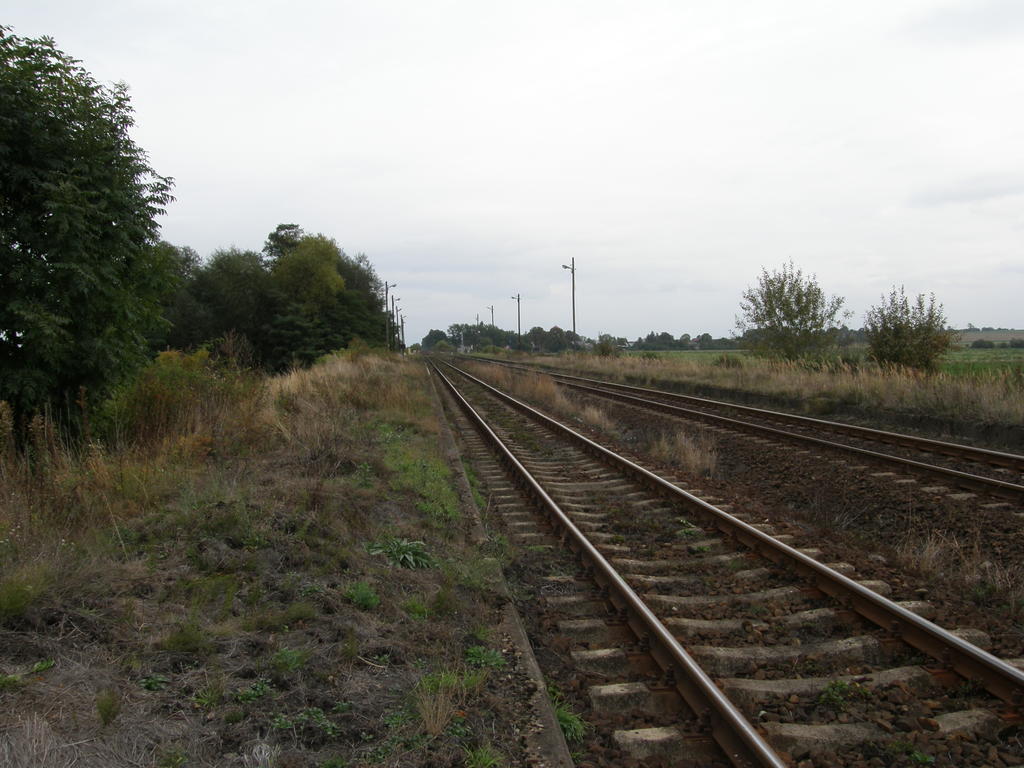 Wyjazd do Prudnika, z lewej strony droga prowadząca do wsi i pusty plac po zburzonym budynku dworca. Widok z peronu 2 w kierunku południowo-wschodnim.