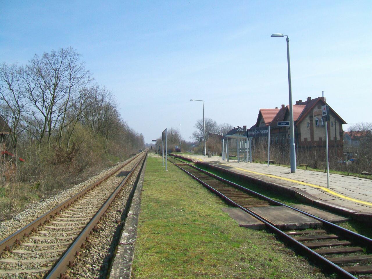 Perony z infrastrukturą dla podróżnych. Widok w kierunku wschodnim (Kędzierzyn-Koźle Port). Z lewej strony kadru starotorze dawnej bocznicy prowadzącej z Fabryki Celulozy i Papieru Koźle.