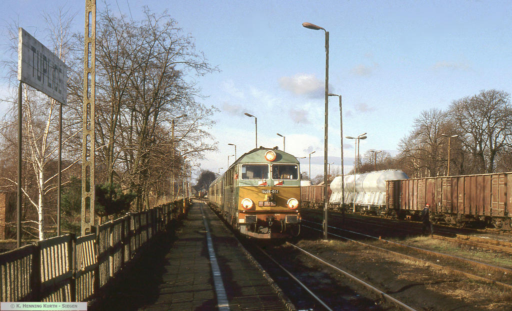 SU45 przy peronie 1 w Tuplicach. Widok w kierunku południowo-wschodnim; w lewo Sieniawa Żarska/Żary i Łęknica/Bad Muskau.