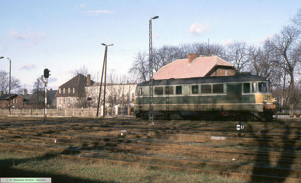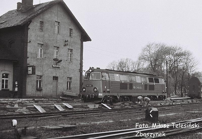 Widzimy remontowane torowisko oraz lokomotywę SP45, która przyprowadził pociąg z Leszna na peron 1. Widok w kierunku południowo-zachodnim; w prawo Forst i Lubsko.
