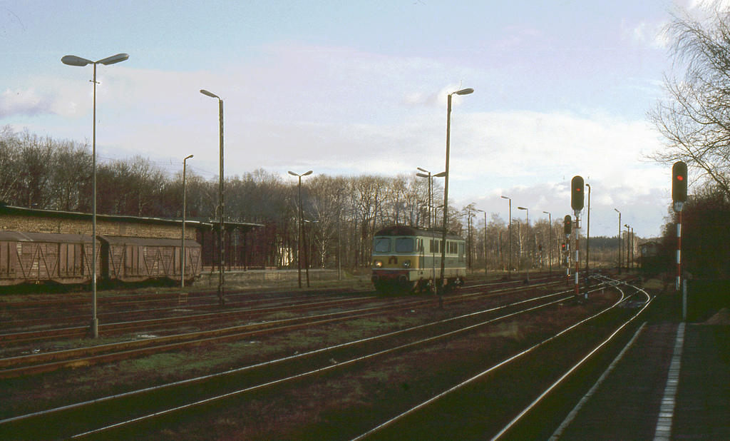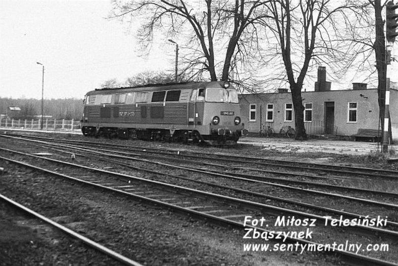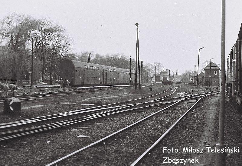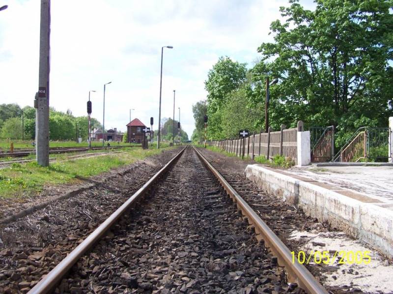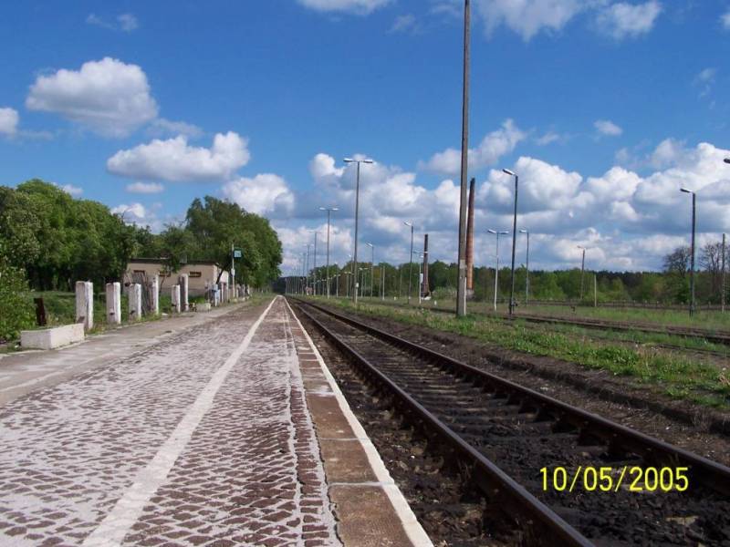 Peron 1 obsługujący ruch w relacjach do Lubska i Tuplic, stoi przy nim Rumun ze składem towarowym, najprawdopodobniej do Łęknicy. W momencie wykonania fotki ruch pasażerski w kierunku Lubska był już zawieszony ale składy towarowe wyprawiano jeszcze do Nowej Roli. Dziś ta część stacji to opuszczona i zarośnięta połać terenu, z rozebranymi torowiskami i zdewastowanym budynkiem dworca oczekującym na rozbiórkę. Widok w kierunku zachodnim (wyjazdy na Lubsko i Forst).