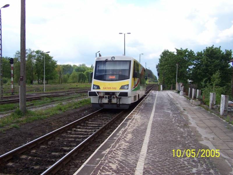 SA105-102 przy peronie 4 w Tuplicach skończył bieg. Niestety nie ma możliwości wjazdu na szlak niemiecki (???). Od strony Forst pasażerów przywożą do Tuplic busy DB. (w rozkładzie jazdy na bieżący rok istnieje połączenie kolejowe z Tuplic do Forst). Widok w kierunku zachodnim (Forst, kiedyś Lubsko).