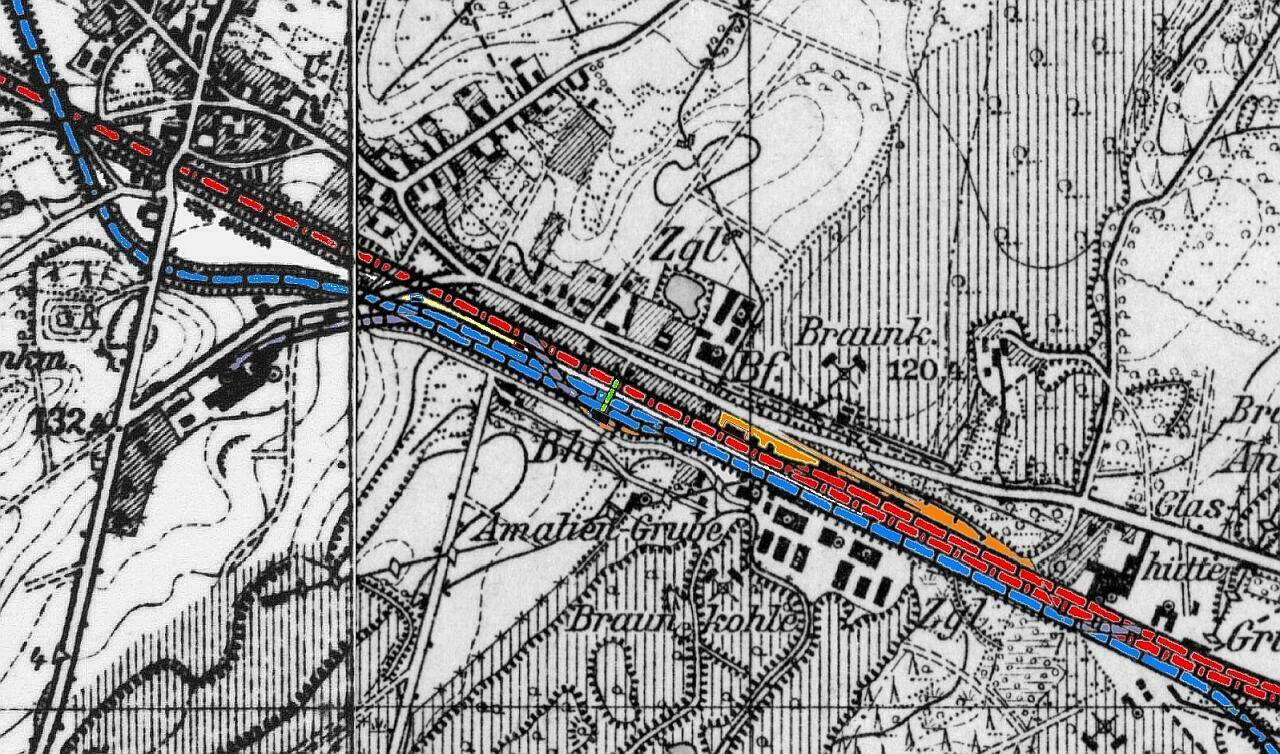 Wycinanka z M-blatt z zasobów Mapster, nominalnie z 1925, obrazuje zasadniczą część węzła w Tuplicach w I ćwierci XX w. Od 1872 przebiega tędy linia główna (czerwony) kolei państwowych (od 1885) ze stacją rozbudowaną po stronie północnej. Dane z M-blatt zawsze są fragmentaryczne, ale widać tam rozległą część handlową (pomarańczowy) z placem dworcowym i magazynami wzdłuż drogi zakończonej placem ładunkowym. Na placu nie zaznaczono torów, które pojawiają się na późniejszych wydaniach map - poza końcówką wąskiego. Po stronie południowej funkcjonuje stacja prywatnej kolei bocznej, młodszej o pokolenie, z dworcem u wylotu przejścia podziemnego (zielony). Tunel ten m.in. komunikuje obydwie stacje w ruchu pasażerskim - ciekawe, jaki podmiot i kiedy sfinansował budowę. Ale kolej dotarła tu z uwagi na złoża i przetwórstwo kopalin, stąd ważniejsze są tory na przedłużeniu dróg zwrotnicowych (fioletowy). Tu jest interesujące, jak regulowano kwestie udostępniania infrastruktury dla prac ładunkowych i manewrów wobec znacznego zagęszczenia nadawców, z których (kopalnie węgla brunatnego, cegielnie, producenci szkła) część korzystała z bocznic. Zarząd kolei głównej jako pierwszy nabył grunty i zagospodarował przestrzeń zgodnie ze swoimi ówczesnymi potrzebami i wizjami rozwoju. Kolej prywatna uruchamiana 25 lat później musiała dokupić, co pozostało, dorównać do niwelety, podeprzeć dworcem skarpę od południa i rozmieścić zaplecze trakcyjne po obu stronach toru głównego zasadniczego na zachodniej głowicy (M-blatt nie pokazuje tych dwóch hal, ich zdjęcia są w galerii). Być może w jakimś okresie do naładunku wykorzystywano pas terenu dostępny z ulicy pomiędzy przejazdami (żółty).