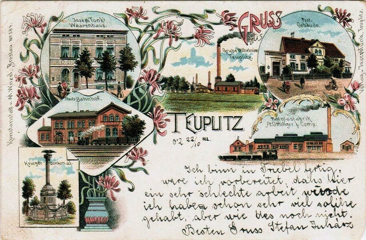Pozdrowienia z Tuplic, październik 1902. Ich autor nie uczył się neogotyckiej kaligrafii, dzięki czemu są dość czytelne. Do jakiej przyznawał się narodowości? Na litografii m.in. dworzec kolei państwowej i fabryka szkła taflowego Ottlinger (podobno dysponowała bocznicą).