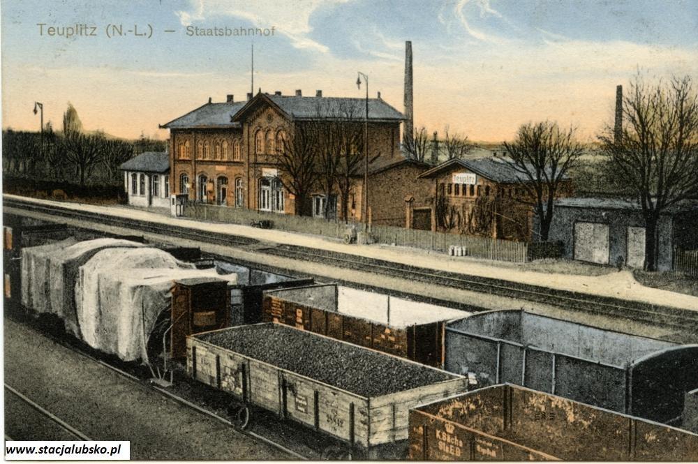 W tabelach publicznych rozkładów jazdy używano nazwy geograficznej Teuplitz, początkowo w suplementach precyzując, że Staatsbahnhof i Lausitzer Nebenbahnhof dzieli odległość przesiadania 280 m, w późniejszych czasach wyróżniając Reichsbahnhof i Nebenbahnhofw spisie alfabetycznym Kursbucha. Gdy w 1939 upaństwowiono Kolej Łużycką likwidując wrzody na d… kolei Rzeszy, małej stacji pozostawiono znaną publiczności nazwę Teuplitz Nebenbahnhof. Być może wówczas doszło do jakiejś optymalizacji układu torowego i UZRK z punktu widzenia jedynego już operatora. Zanim w 1945 koła historii (tzn. T-34) przejechały się po dużym dworcu (wysokiej, II klasy), Teuplitz Nebenbahnhof formalnie nie był już stacją, a tylko przystankiem (Haltepunkt) z nieco nadmiarowym budynkiem.