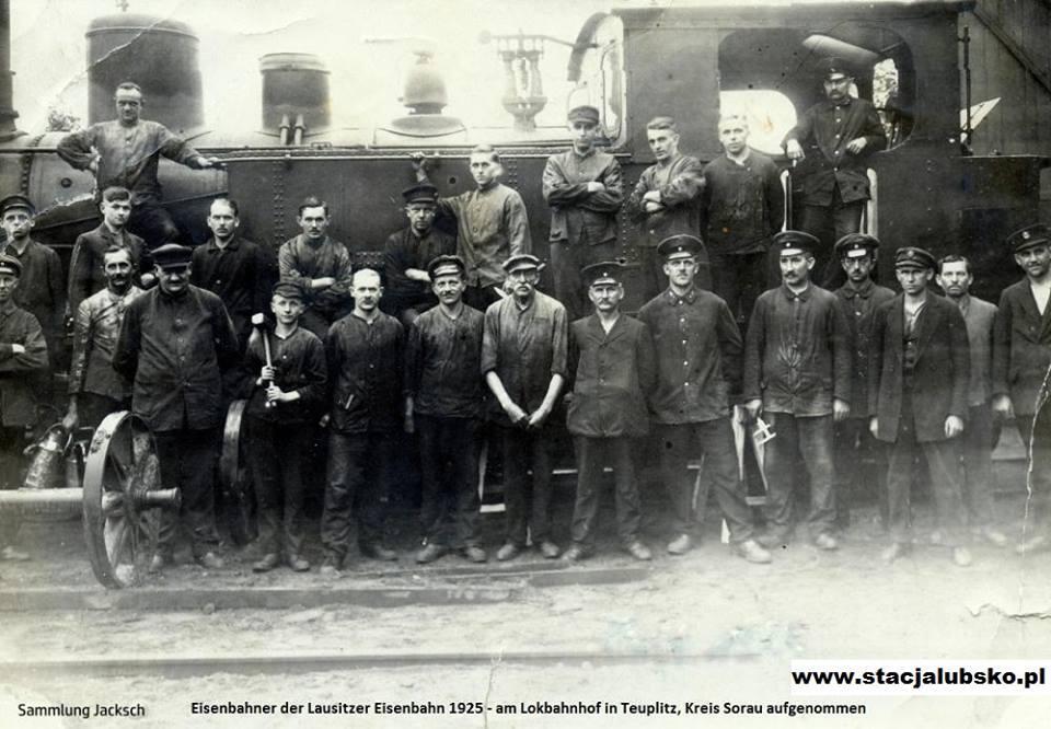 Fotka kolejarzy Kolei Łużyckiej (spółki LEAG z siedzibą w Sommerfeld/Lubsku) na tle parowozu na dworcu Kolei Łużyckiej w Tuplicach, jak głosi podpis pod fotką. W Tuplicach znajdowały się warsztaty kolejowe LEAG z szopą. Data pewna to 1925 r., tylko trzeba wpisać miesiąc i dzień -inaczej nie przechodzi).
