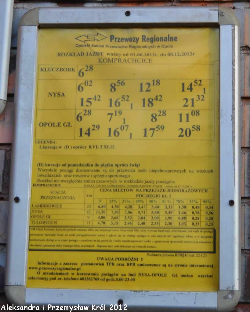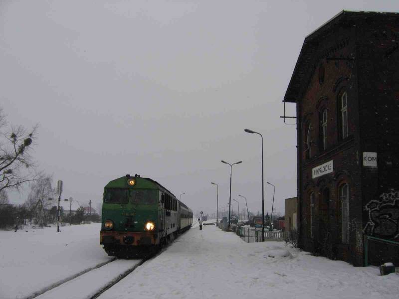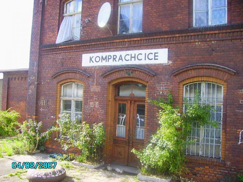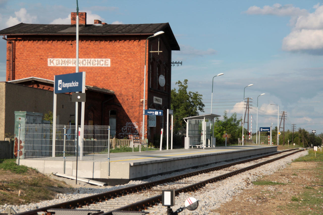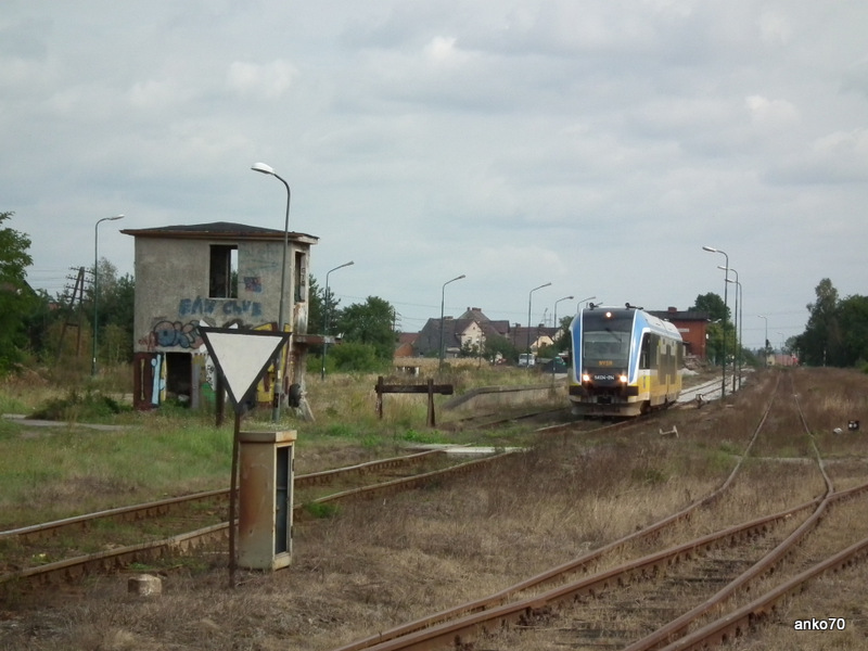 Regio do Nysy opuszcza Komprachcice. Z lewej zdewastowana nastawnia wykonawcza. Widok od strony wjazdu z Szydłowa/Nysy.