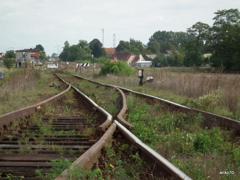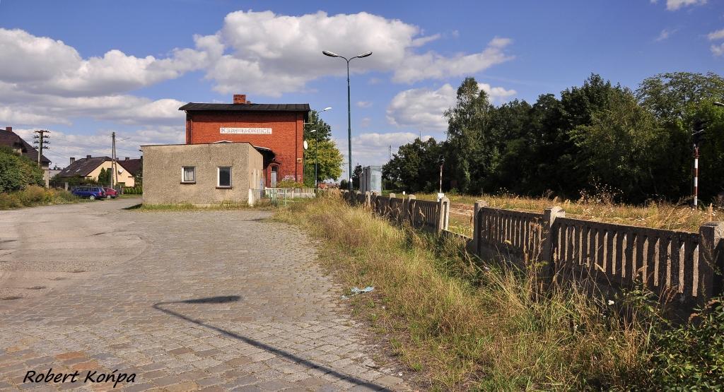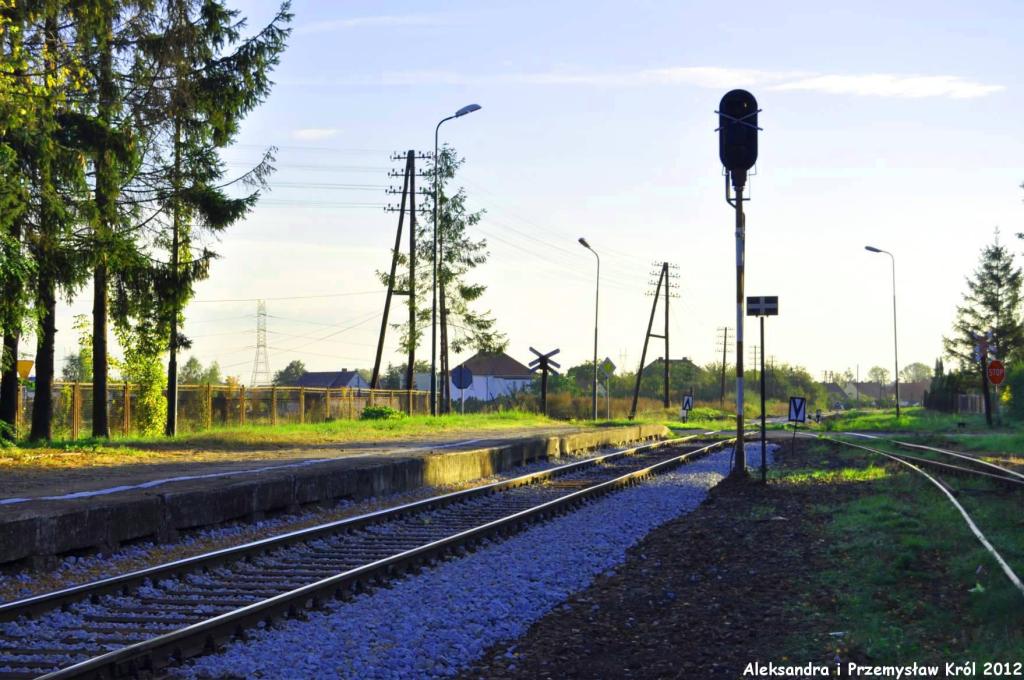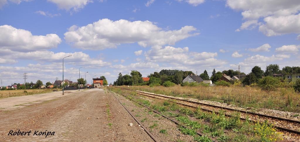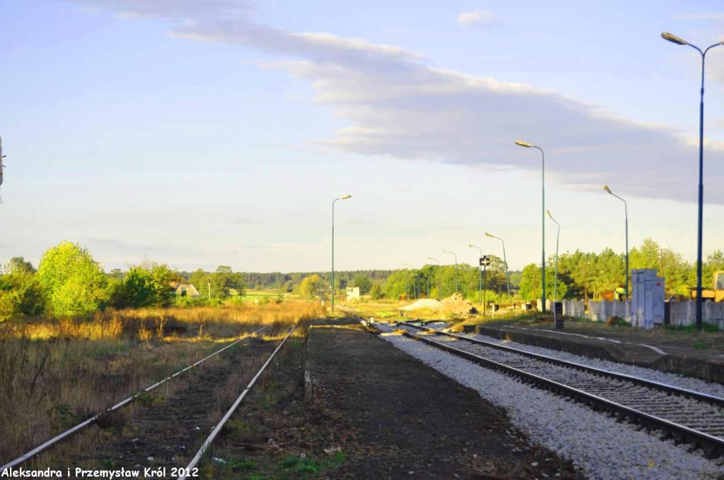 Widok na dawną stację z okolic rozjazdu bocznicy na lotnisko. Z prawej tor z Szydłowa/Nysy, z lewej tor z lotniska.