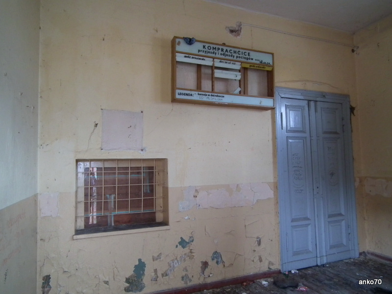 Poczekalnia (teoretycznie zamknięta), okienko kasowe i pozostałość tablicy rozkładowej.