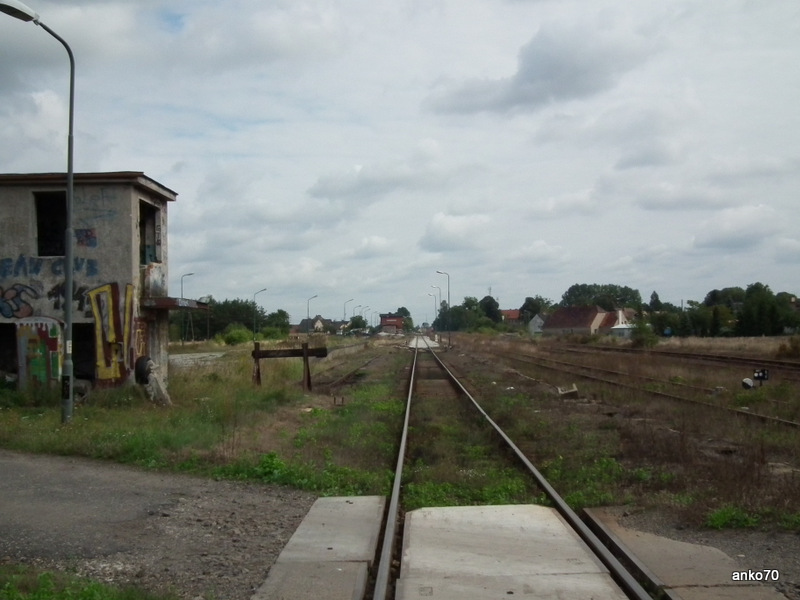 Widok na dawną stację w kierunku Opola. Nieczynne semafory wyjazdowe. Z lewej perony i budynek dworca, w którym mieściła się nastawnia dysponująca.